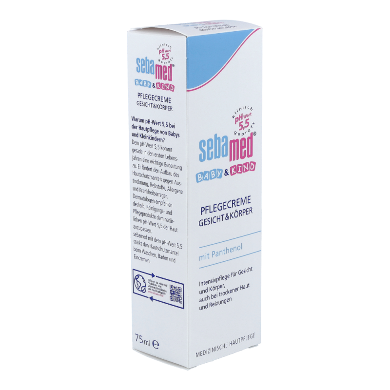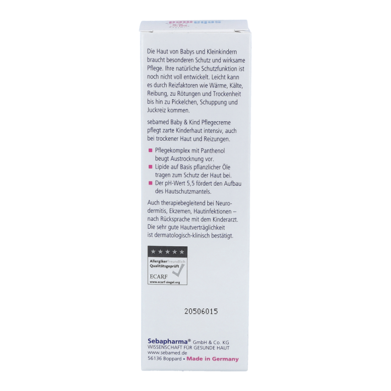sebamed Baby & Kind Pflegecreme pflegt zarte Kinderhaut intensiv, auch bei trockener Haut und Reizungen. Auch therapiebegleitend bei Neurodermitis, Ekzemen, Hautinfektionen – nach Rücksprache mit dem Kinderarzt. Die sehr gute Hautverträglichkeit ist dermatologisch-klinisch bestätigt.
