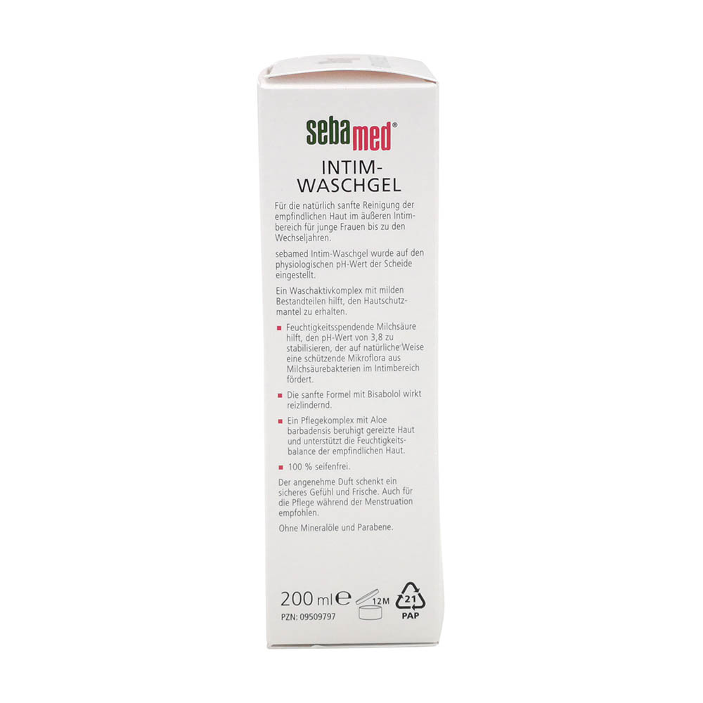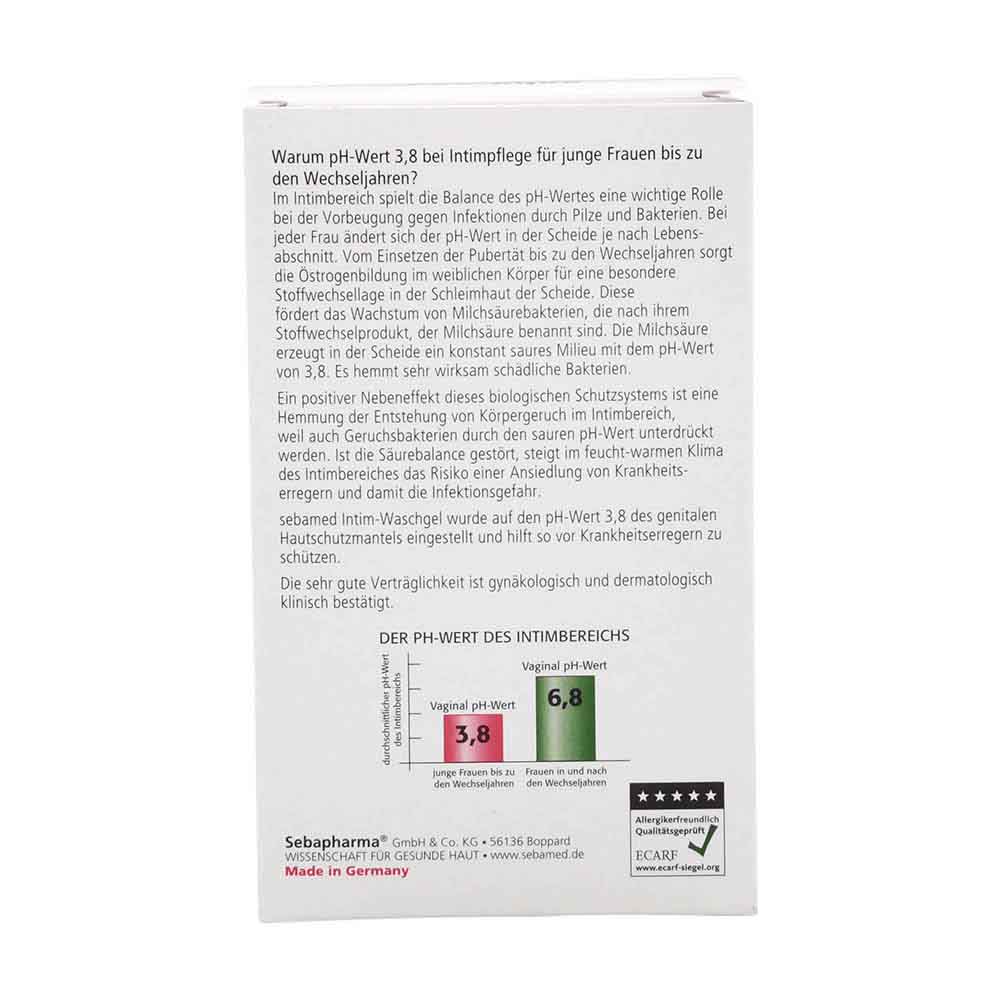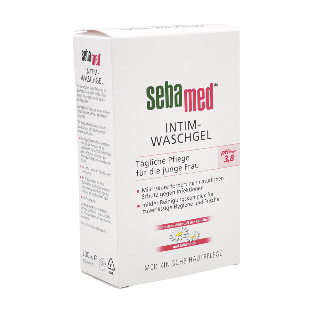sebamed Intim-Waschgel 3,8 wurde auf den physiologischen pH-Wert der Scheide abgestimmt und ist 100% seifen- und alkalifrei. Der pH-Wert 3,8 hilft, den Hautschutzmantel im Genitalbereich zu erhalten, das Gleichgewicht der Mikroflora zu stabilisieren und so vor Infektionserregern zu schützen. Die sanfte Formel mit Bisabolol, dem Wirkstoff der Kamille, wirkt reizlindernd. Ein Pflegekomplex mit Aloe barbadensis beruhigt gereizte Haut und unterstützt die Feuchtigkeitsbalance der empfindlichen Haut. Auch für die Pflege während der Menstruation empfohlen und als therapieunterstützende Intimhygiene geeignet.