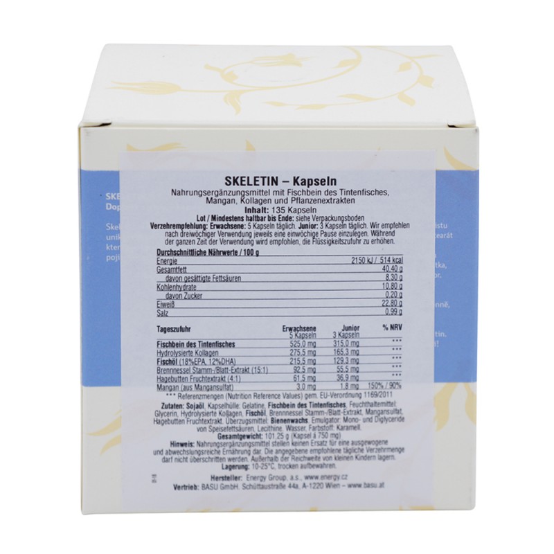 Skeletin Kapseln sind ein Nahrungsergänzungsmittel mit Fischbein des Tintenfisches, Mangan, Collagen-Hydrolysat und antioxidativ ernährungsuntestützenden Pflanzenextrakten. Skeletin kann den Körper bei der Harmonisierung der Meridiane, der Gelenke, Haut und Knochen unterstützen.