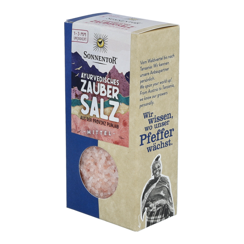 Das Sonnentor Ayurvedisches Zaubersalz® mit 150 g für Salzmühlen, rosa schimmernd und mild im Geschmack, ist bei der Austrocknung des Urmeeres vor 30 Millionen Jahren entstanden. Es wird noch heute traditionell in Punjab in Pakistan abgebaut – denn Salz ist nicht gleich Salz.