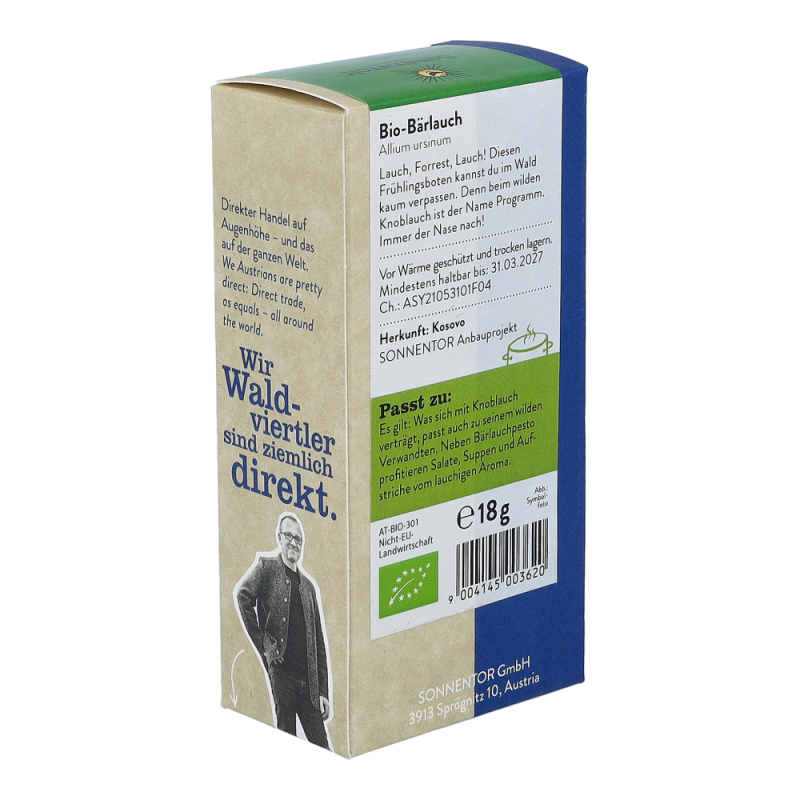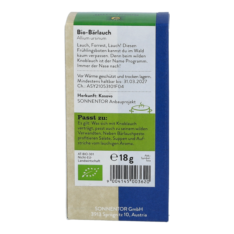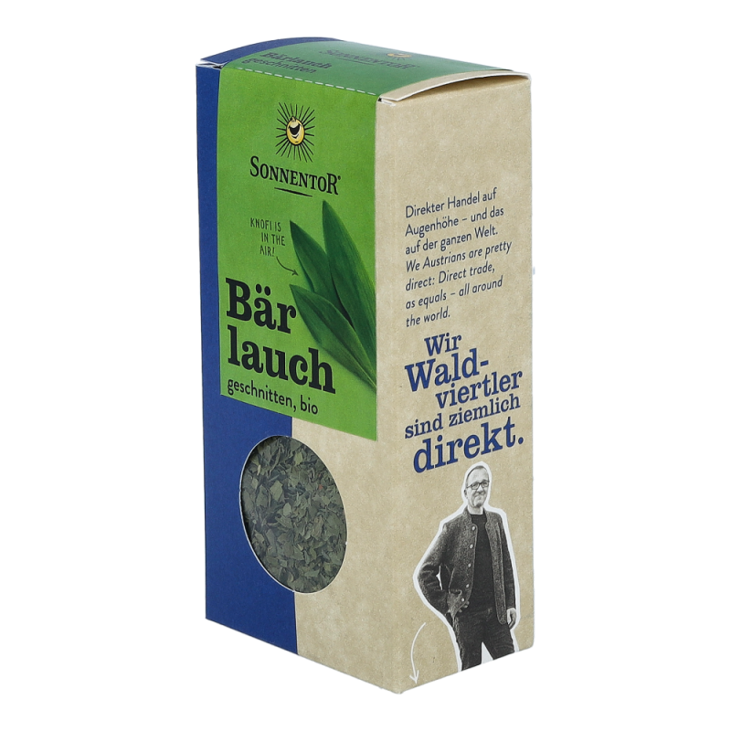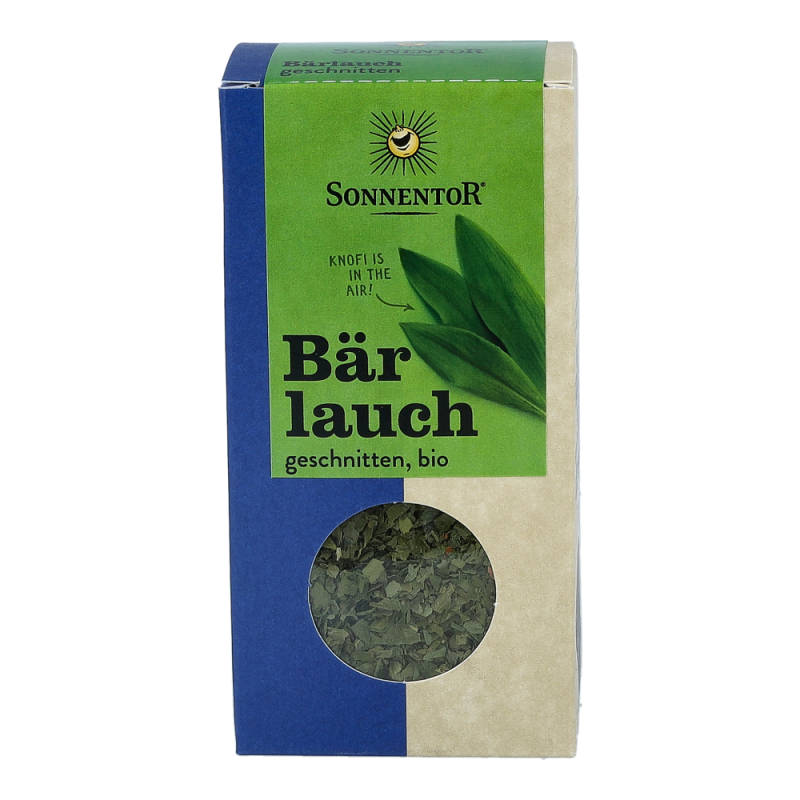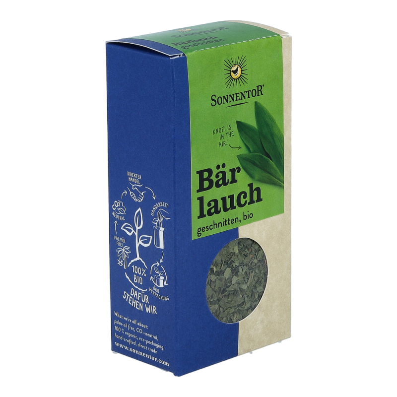 Sonnentor Bärlauch geschnitten in der 18 g Packung verhilft Kartoffel- und Gemüsegerichten mit seinem feinen, knochlauchigen Aroma zu wahren Geschmackserlebnissen. Himmlisch schmeckt das Bärlauchkraut auch in Aufstrichen, Pestos und Suppen.