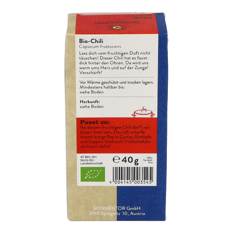 Sonnentor Chili gemahlen in der 40 g Packung begeistert all jene, die mit Ihrer Liebe zu scharfem Essen oftmals die Grenze zwischen Genuss und Schmerz überschreiten. Der fruchtige Duft der Bio Chilischoten zeichnet ein harmloses Bild, jedoch bewegen sich die Schärfegrade in einem Bereich von 6 bis 10 feurigen Punkten (genauere Informationen zum Schärfegrad sind auf der Verpackung angegeben). Darf’s noch ein bisschen schärfer sein? Sonnentor Chili feuerscharf gemahlen in der 40 g Packung überzeugt auch die Hartgesottenen.