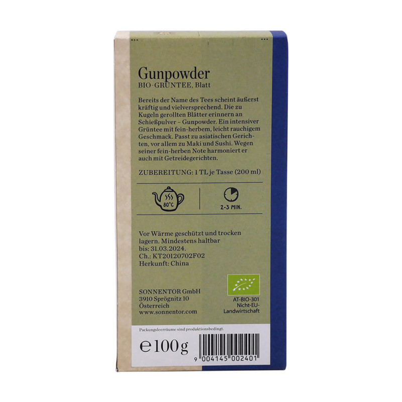 "Der herbe Geschmack des fernen Ostens" Gunpowder, aus China stammend, ist ein intensiver, fein-herber, leicht rauchiger Grüntee. Die zu Kugeln gerollten Blätter erinnern an Schießpulver – Gunpowder.