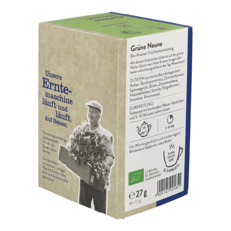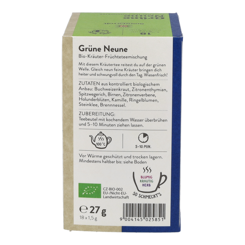 Frühjahrsblues? Die Kraft von neun Kräutern bringt selbst Siebenschläfer in Schwung. Die Zahl kommt nicht von ungefähr, gilt sie doch als magisch und in der Tradition der Kräuterkunde verankert. Unsere Mischung aus Zitronenthymian, Steinklee und Co. leuchtet in einem hellen grün und erfrischt mit einer grasigen Note. Für alle Springinkerl und die, die es noch werden wollen.