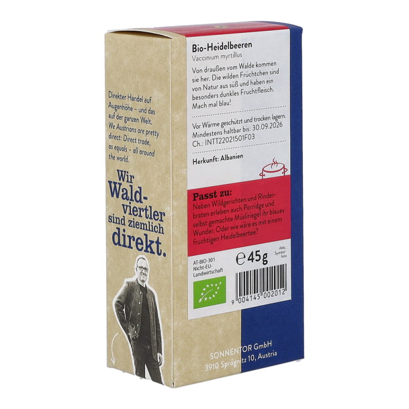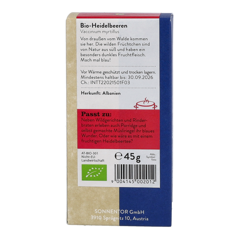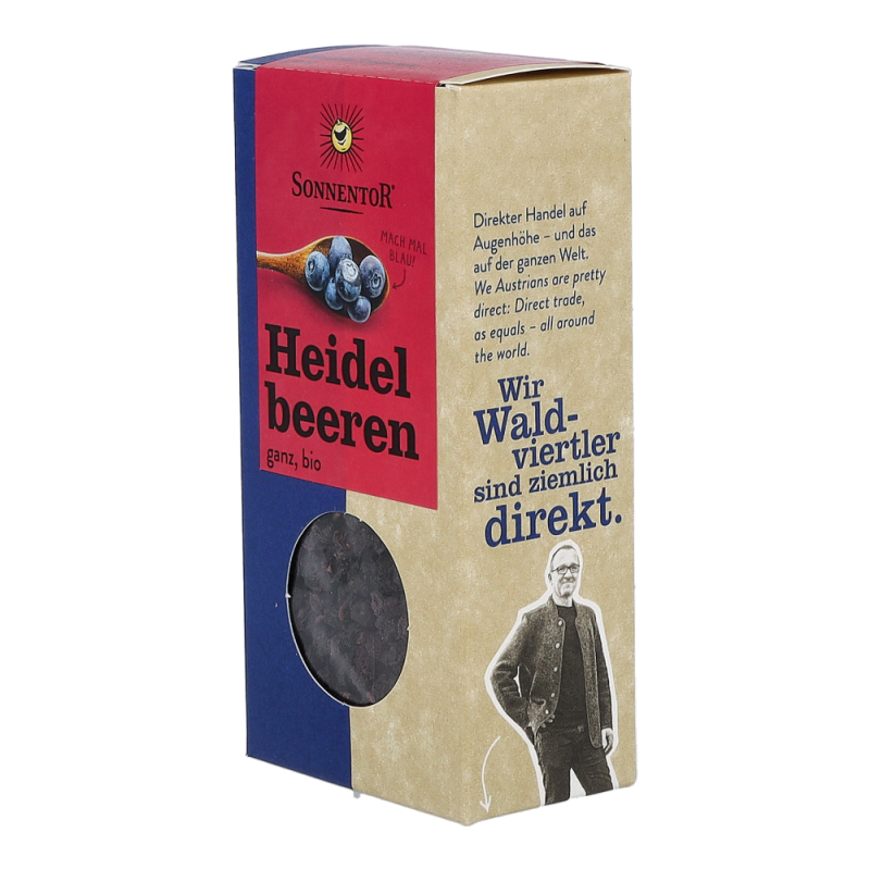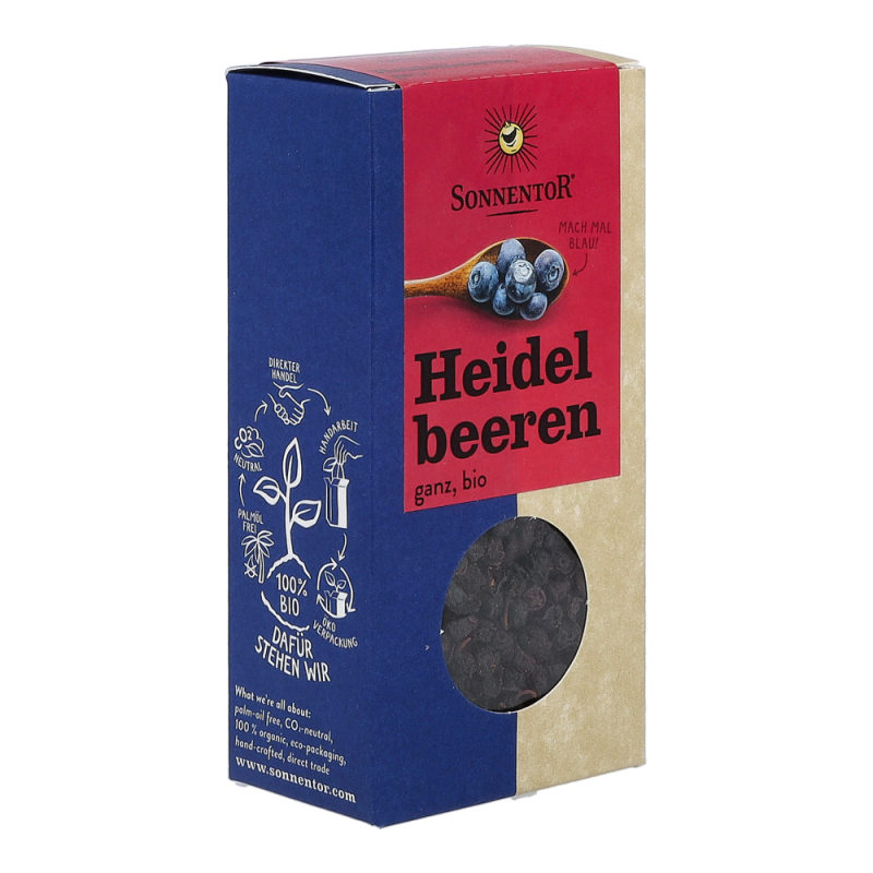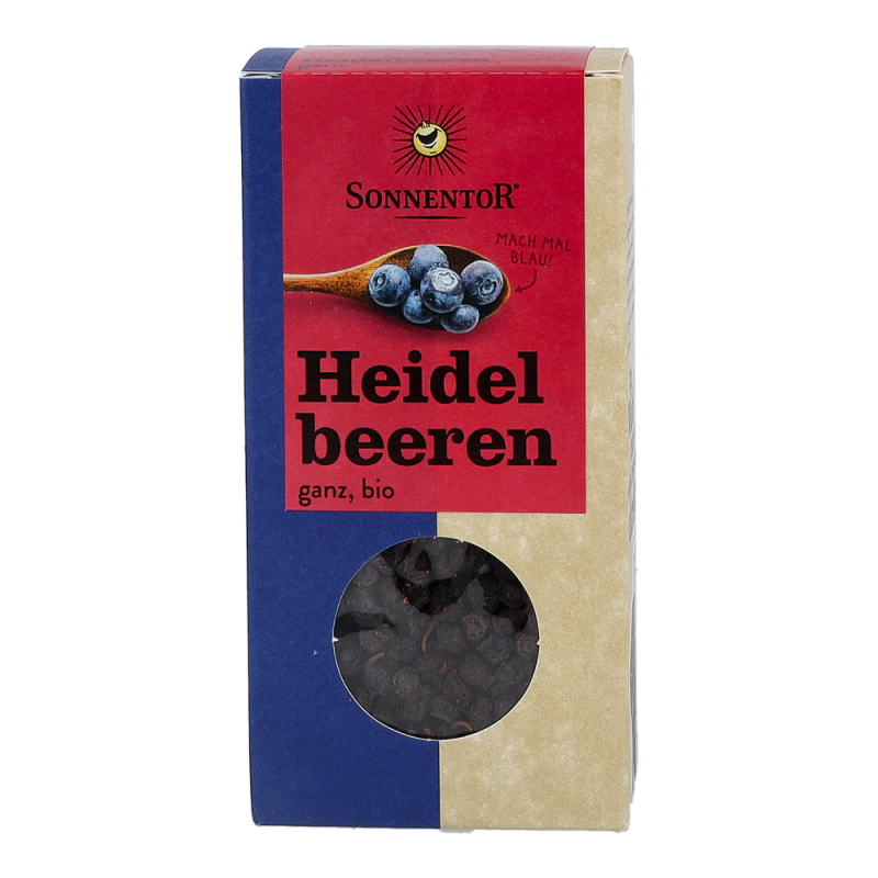 Die Sonnentor Heidelbeeren im 45 g Päckchen sind echte Wildheidelbeeren aus dem Wald, ersichtlich an ihrem dunkelblauen Fruchtfleisch, und werden liebevoll von Hand abgepackt. Aus den getrockneten Beeren kann man nicht nur einen köstlichen Tee zubereiten, sondern sie eignen sich auch wunderbar zum Verfeinern von Wildgerichten und Rinderbraten. Zudem sind sie ein altbewährtes Hausmittel gegen Durchfall.