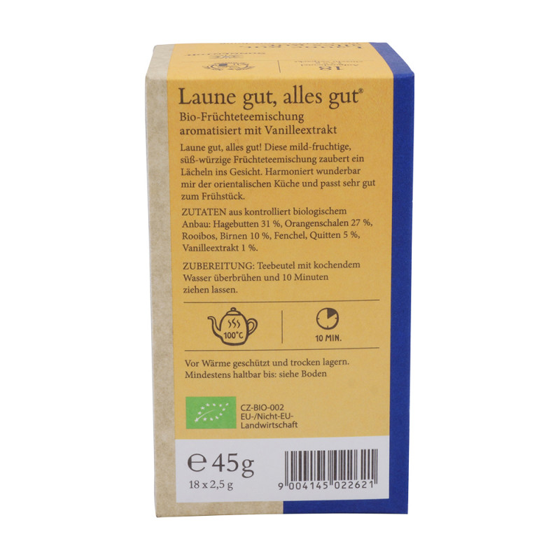 18 Aufgussbeutel à 2,5 g "Gute Laune ist ansteckend!" Wir zaubern ein Lächeln auf dein Gesicht! Dieser wunderbar-aromatische Früchtetee u. a. mit Hagebutten, Rooibos, Birnenstücken, Quittenstücken und einem Hauch von Vanille ist sehr bekömmlich. Auch lose erhältlich. Probieren Sie auch unsere andere Gute Laune-Mischung (Gute Laune-Kräutertee). Tipp: Kalte Früchtetees sind wunderbare Erfrischungen, die pur, leicht gesüßt oder mit Fruchtsäften vermischt getrunken werden können. Mit erkaltetem Früchtetee lässt sich auch leckeres Früchtetee-Eis zaubern, das mehrere Sünden wert ist. Auch lose erhältlich.