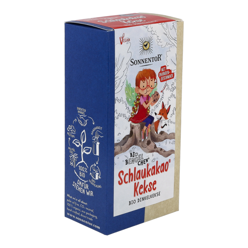 Sonnentor Schlaukakao Kekse Bio-Bengelchen® 125 g mit dem wunderbar schokoladig-orangigen Geschmack sind für große und kleine Krümelmonster bestens geeignet. Dinkelmehl und der Bio-Bengelchen Schlaukakao bilden die Grundlage für die Kekse in Bengelchen-Form, die ohne Palmöl produziert und ausschließlich mit Kokosblütenzucker gesüßt werden – jetzt bei online bestellen – einfach.sicher.günstig.