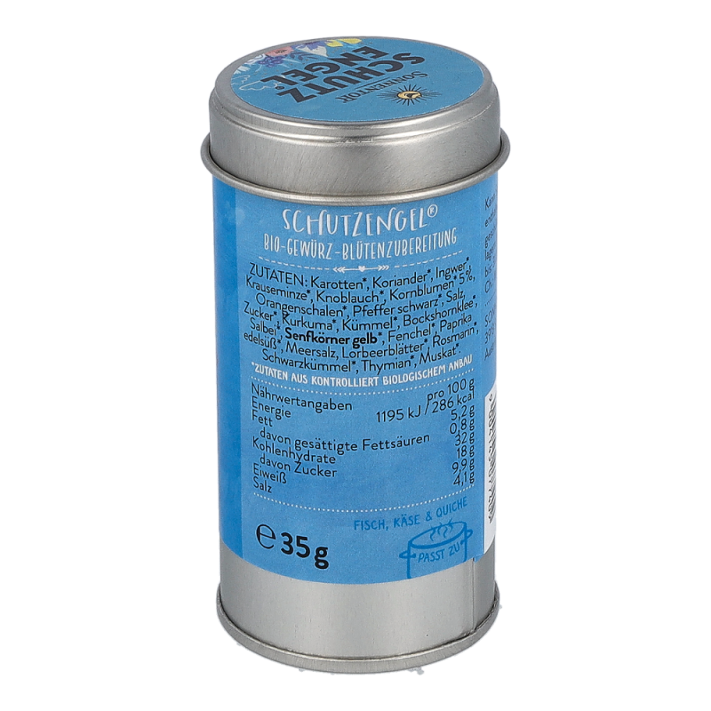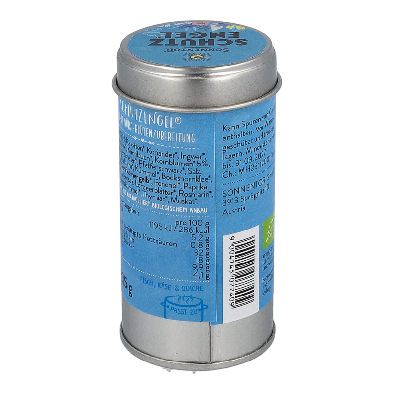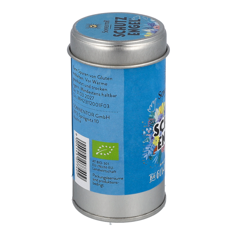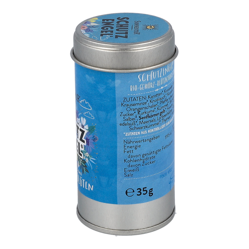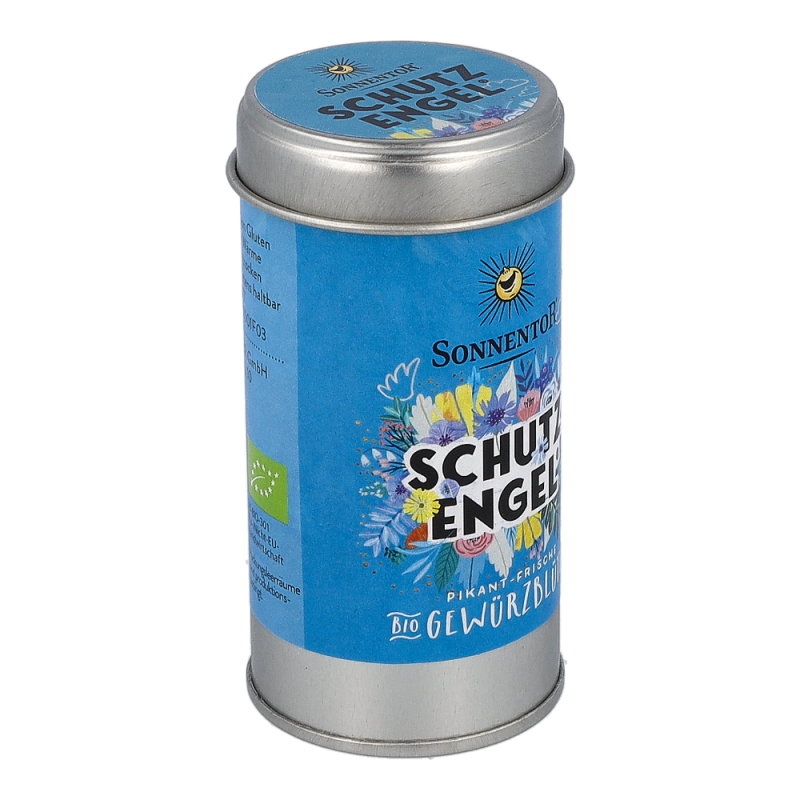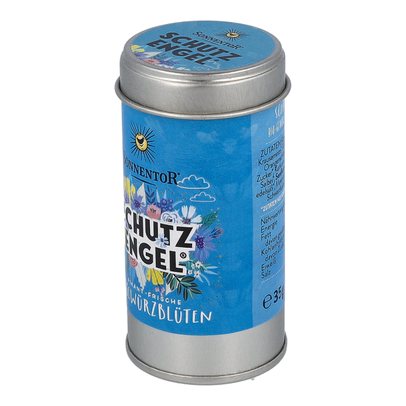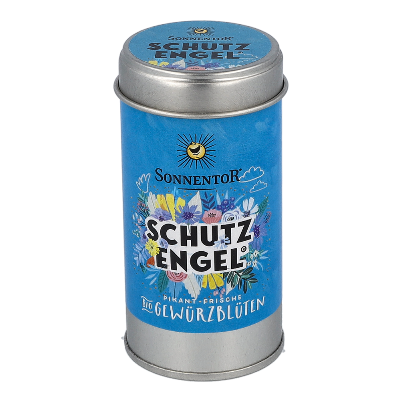 Die Sonnentor Schutzengel® Gewürz-Blüten-Zubereitung in der 25 g Streudose ist eine harmonische Komposition aus Minze, Ingwer und Knoblauch und wird durch eine leichte Schärfe unterstrichen. Himmlisch würzig erscheint die Gewürzmischung in den schönsten Farben des Regenbogens und passt besonders gut zu Reisgerichten, Huhn, Lamm und Gemüse sowie Nudeln und Salatdressings.