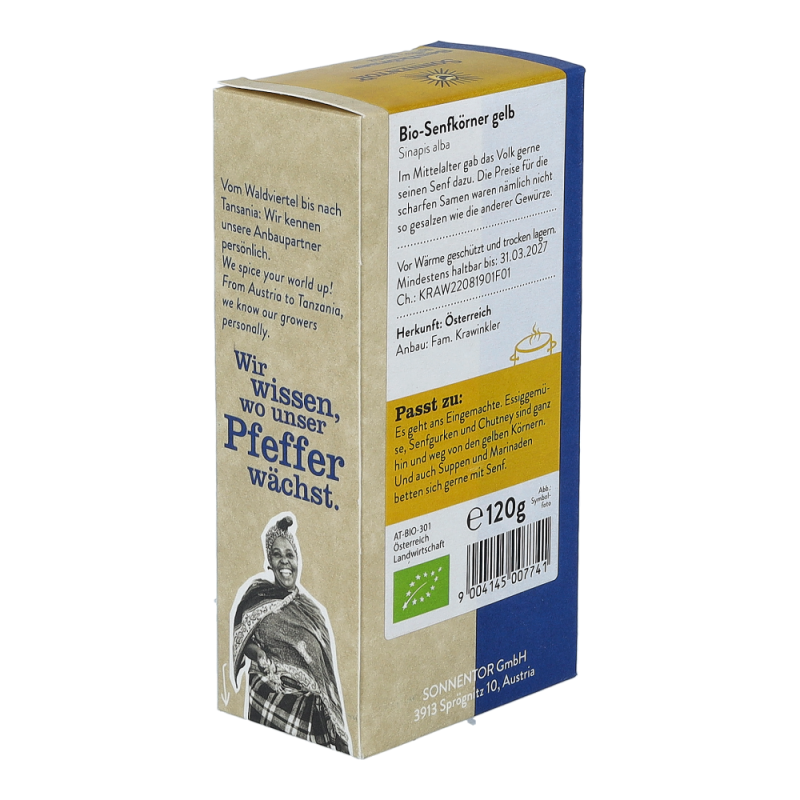 Die Sonnentor Senfkörner gelb in der 120 g Packung werden vor allem für Marinaden, zum Einlegen von Essiggemüse und zum Würzen von scharfen Saucen verwendet. Die scharfen Senföle werden erst durch den Kontakt mit Flüssigkeit freigesetzt und begeistern mit einem einzigartigen Aroma..