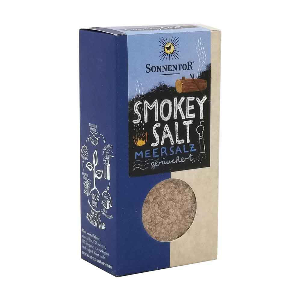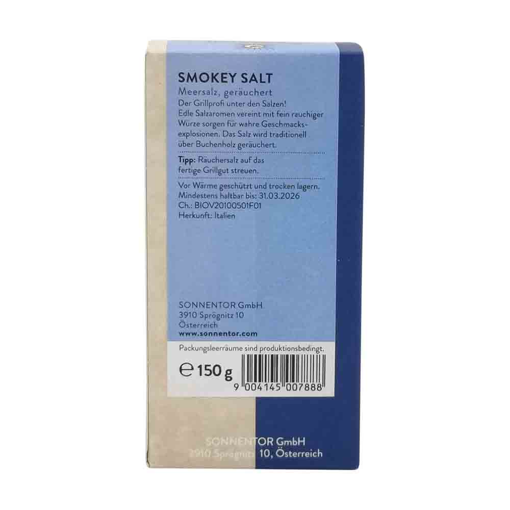 Das Sonnentor Smokey Salt (Schwäbisches Rauchsalz) in der 150 g Packung begeistert Räucherfans mit seinem angenehm rauchigen Duft und passt hervorragend zu Fisch, Linsen und Gegrilltem. Das beige, leicht goldene Salz wird in einer kleinen Räucherei auf der Schwäbischen Alb mit feinstem Buchenrauch geräuchert und von Hand abgepackt.