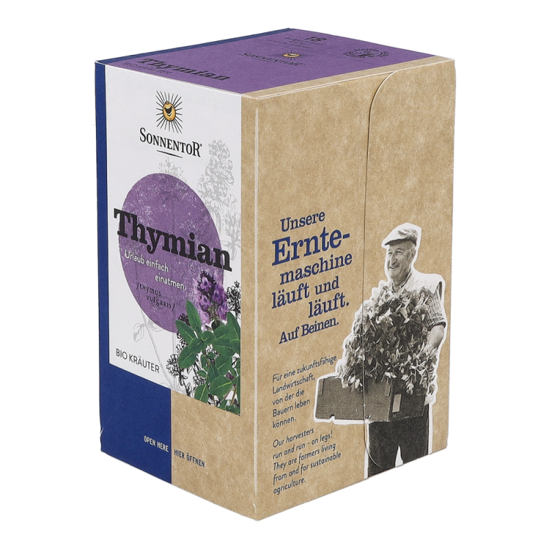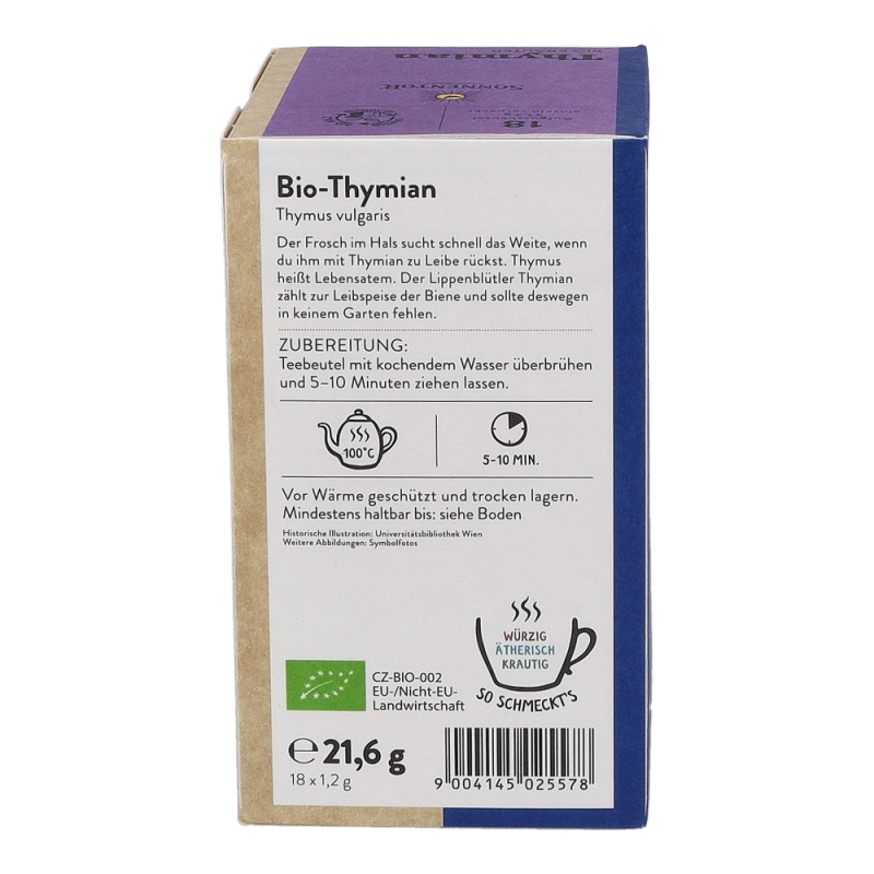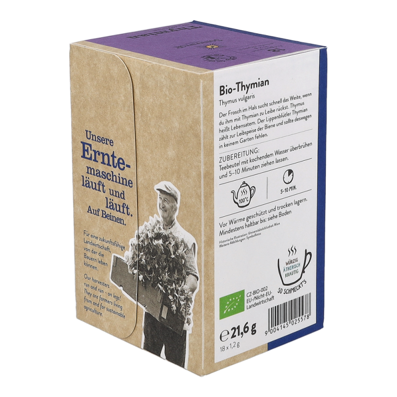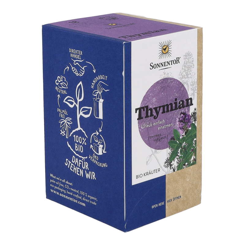 Im Geschmack ist der Tee kräftig und vollmundig mediterran. Thymian wurde früher von Kriegern vor gefährlichen Schlachten genutzt: Ein Bad darin sollte ihnen zu besonderem Mut verhelfen. Heute ist die Pflanze als Bienen- und Augenweide bekannt und sollte deswegen in keinem Garten fehlen. Thymus bedeutet übrigens Lebensenergie.