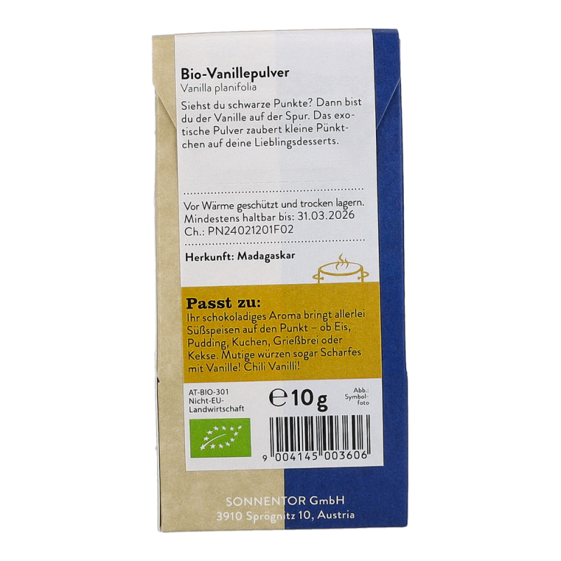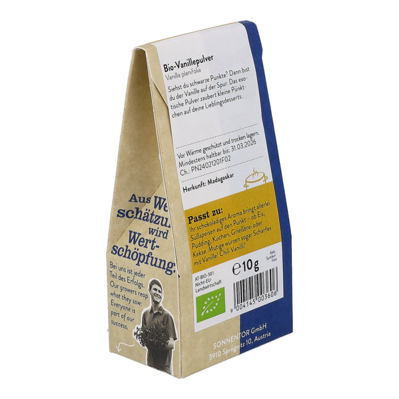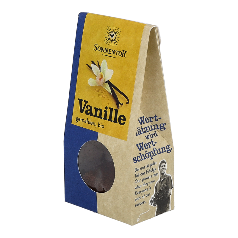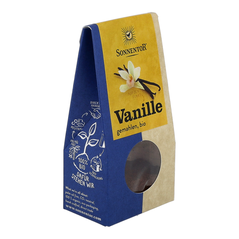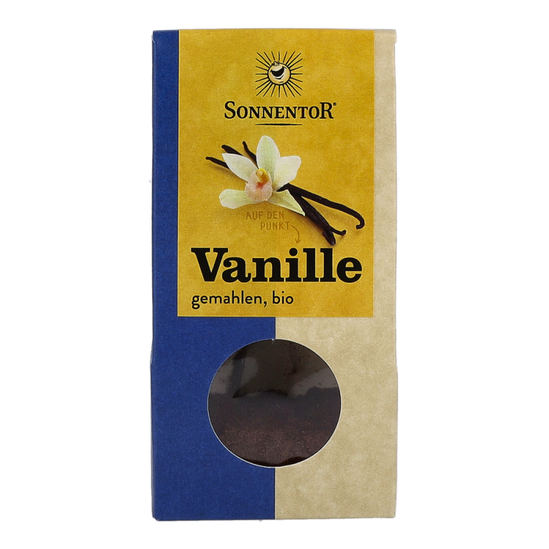 Das Sonnentor Vanille Pulver im 10 g Päckchen wird durch Fermentierung der Fruchtkapseln der Vanilleorchidee gewonnen. Sie überzeugt mit einem sahnig-süßen Aroma, das sich in einer leicht blumigen Parfumnote entfaltet. Sie harmoniert besonders gut mit Milchreis und Co – aber seien Sie mutig: Würzen Sie salzige und scharfe Gerichte damit. Huhn, mexikanische Bohnengerichte, Currys und Jakobsmuscheln profitieren sehr von ihrem Aroma..