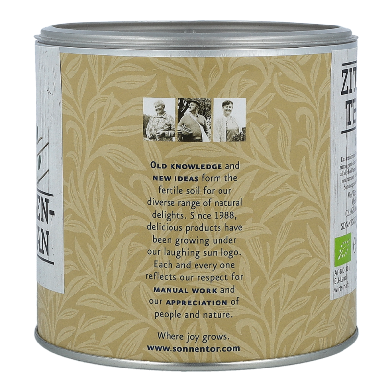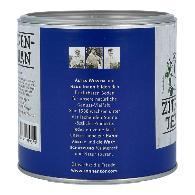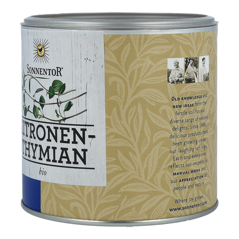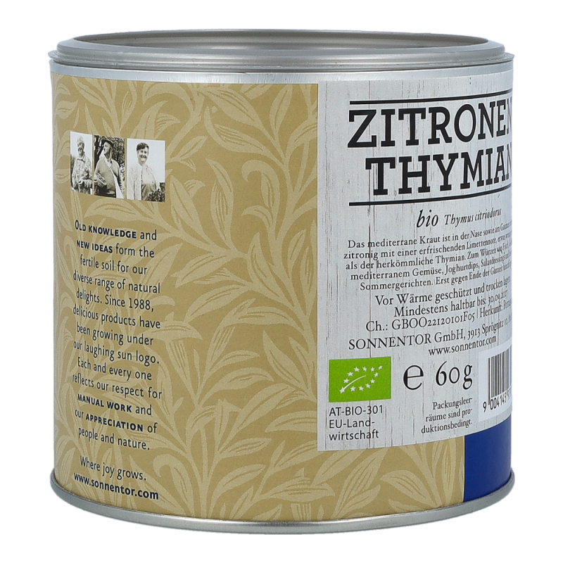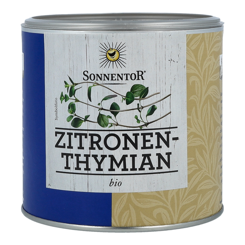 Der Sonnentor Zitronenthymian in der 60 g Gastrodose begeistert mit seinem erfrischend mediterranen und intensiven Geschmackt und zaubert Sie ganz schnell wieder zurück in Ihren letzten Urlaub am Mittelmeer. Zitronige, limettenähnliche Noten vereint mit dem Aroma des Thymians sind ein wahrlich eleganter Begleiter von Fisch, Geflügel, Gemüse und mediterranen Salatdressings. Zitronenthymian sollte erst gegen Ende der Garzeit hinzugefügt werden, denn seine Aromen verflüchtigen sich schnell