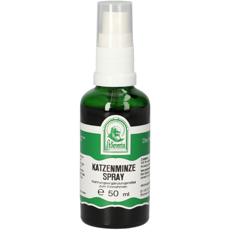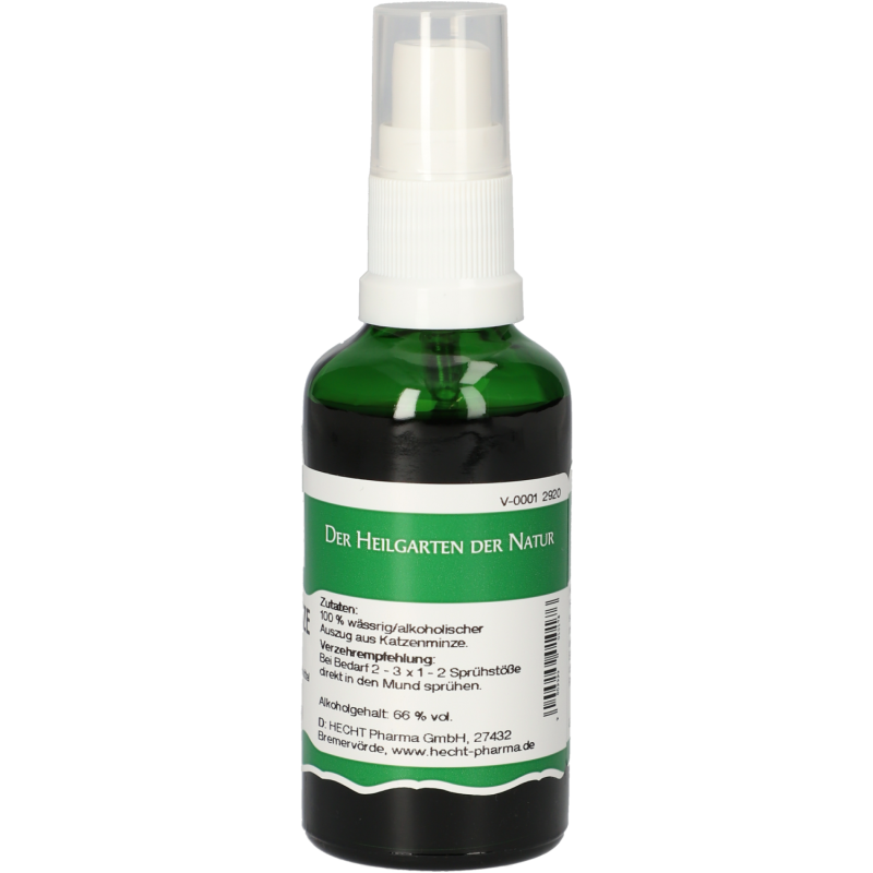 Bei Bedarf 2 – 3 x 1 – 2 Sprühstöße direkt in den Mund sprühen. Die Echte Katzenminze gehört zur Familie der Lippenblütler (Lamiaceae). Zu den wichtigsten Inhaltsstoffen zählen Carvacrol, Thymol, Neptalsäure, Lactone. Der Echten Katzenminze werden fiebersenkende, krampflösende, appetitanregende sowie harntreibende Eigenschaften zugesprochen. Außerdem sind positive Effekte bei Verdauungs-störungen und Schlafproblemen bekannt.