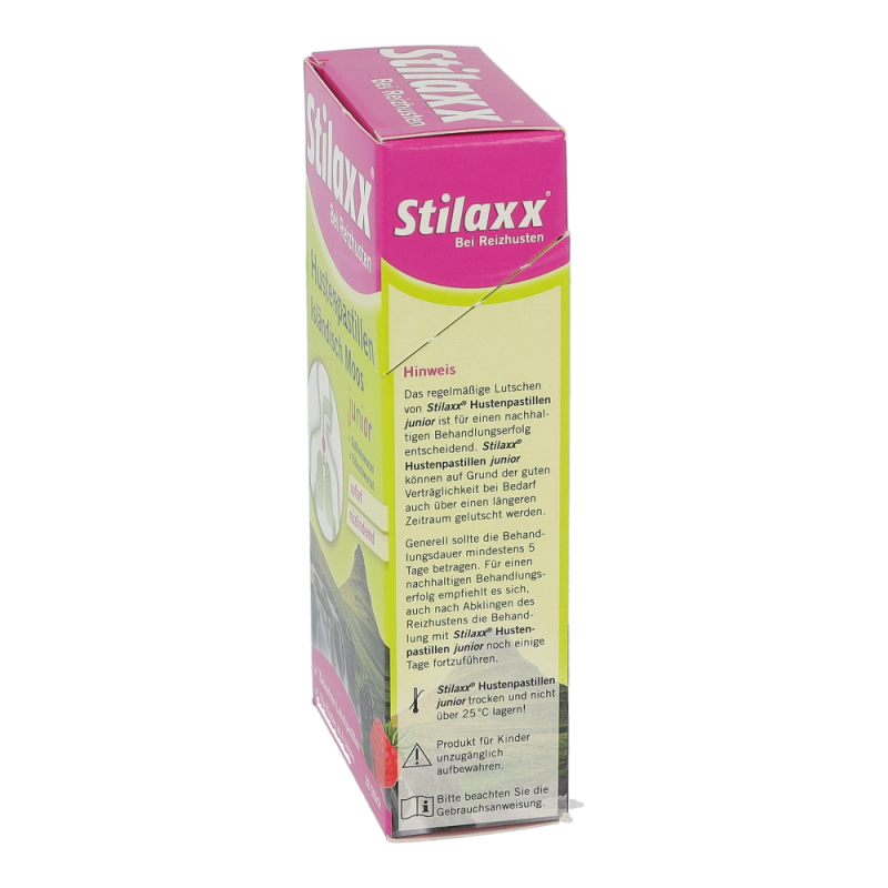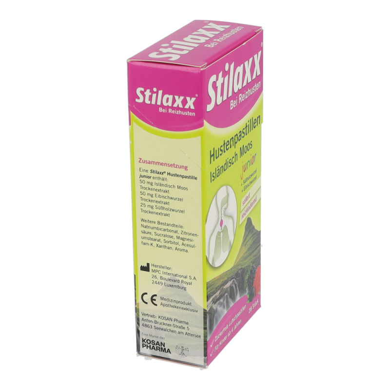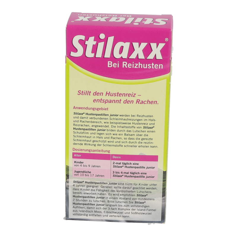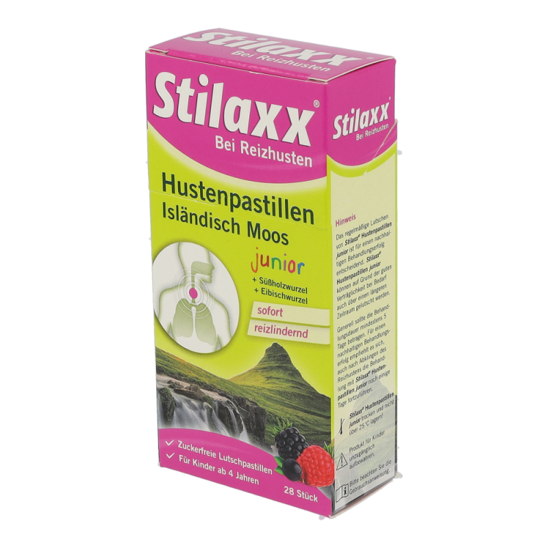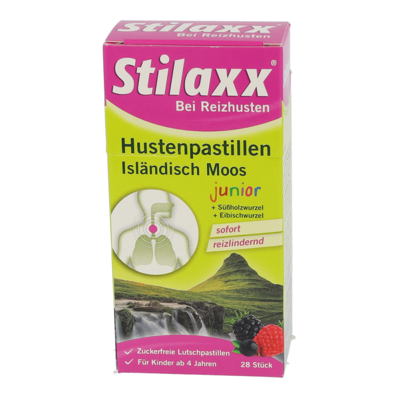 Stilaxx Hustenpastillen reizlindernd bei langanhaltendem, trockenem Reizhusten durch ihre Wirkung aus den natürlichen Pflanzenextrakten von Isländisch Moos, Eibischwurzel und Süßholzwurzel – dem 3-fach Komplex der Island Formel. Die Stilaxx Hustenpastillen junior mit ihrem fruchtigen Mixed-Berry Geschmack sind pflanzlich, sowie alkohol- und zuckerfrei und für Kinder ab 4 Jahren geeignet.