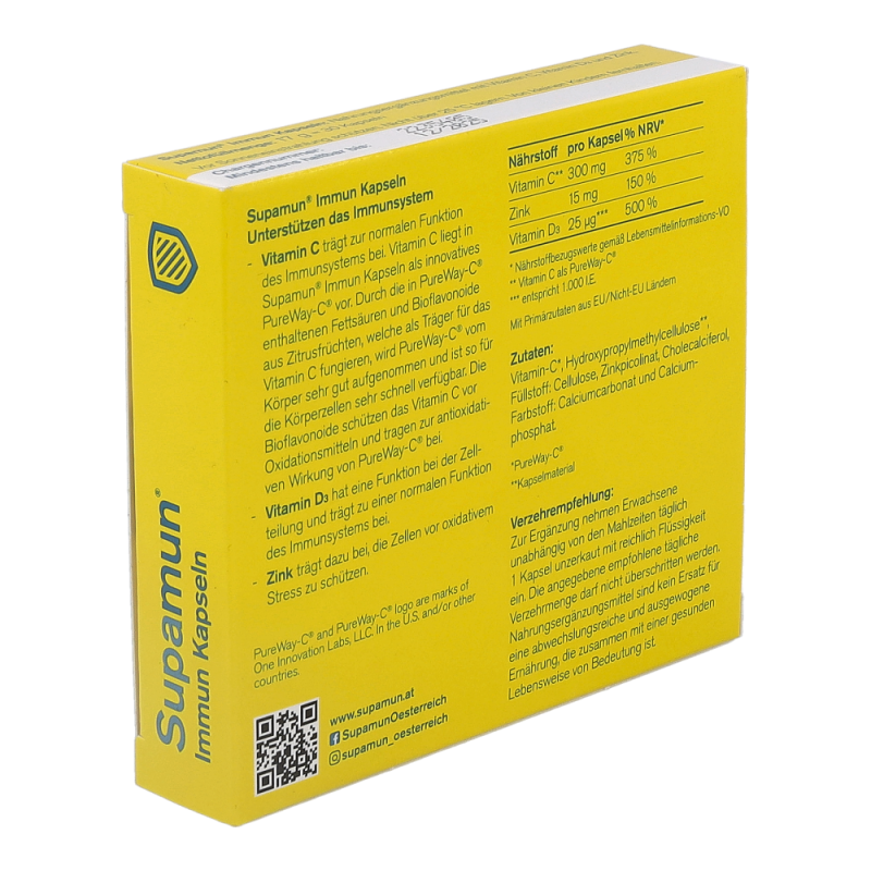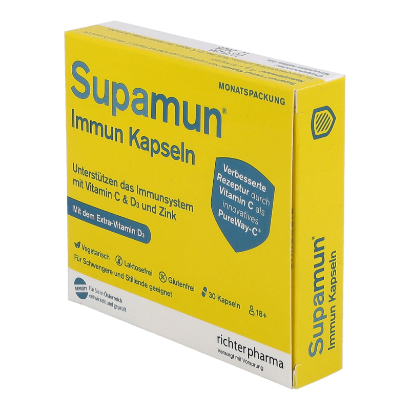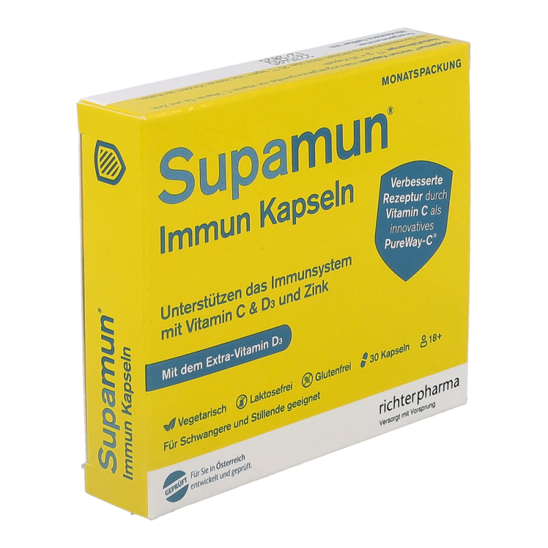 Supamun Kapseln® mit ihrer bewährten Kombination aus den Vitaminen C und D3 sowie dem Spurenelement Zink helfen dabei, das Immunsystem in seiner normalen Funktion zu unterstützen. Die Vitalstoffe schützen den Körper vor oxidativem Stress, vor allem bei und nach intensiver körperlicher Belastung. Stärken Sie Ihr Immunsystem noch heute.
