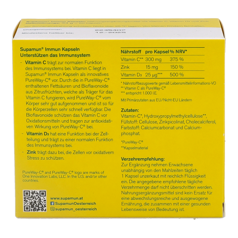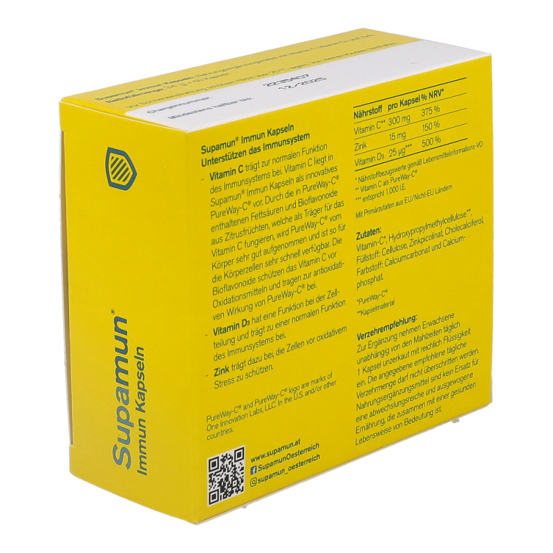 Unterstützt das Immunsystem! Durch Stress und körperlicher Anstrengung ist unser Organismus vielen Belastungen ausgesetzt. Um diesen Belastungen standhalten zu können, ist es wichtig, ausreichend mit Vitaminen und Spurenelementen versorgt zu werden. Supamun® Immun Kapseln,nur einmal täglich eingenommen, können durch die ausgewogene Dosierung von Vitamin C und D3 sowie dem Spurenelement Zink zur normalen Funktion des Immunsystems beitragen.
