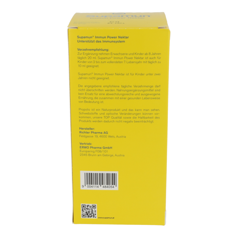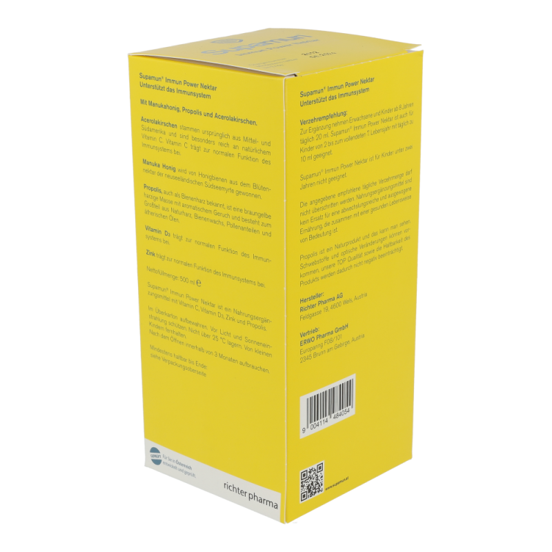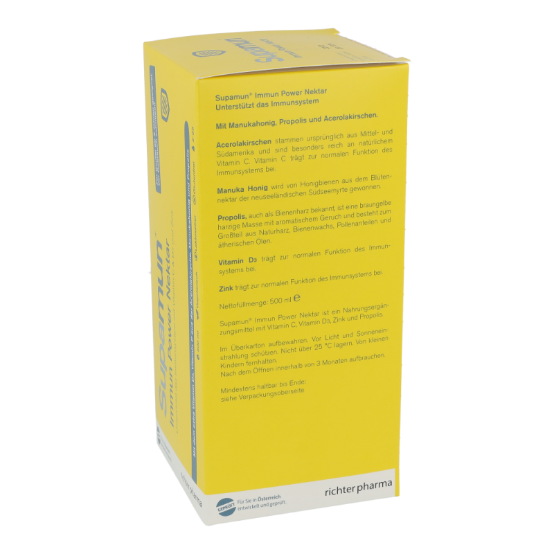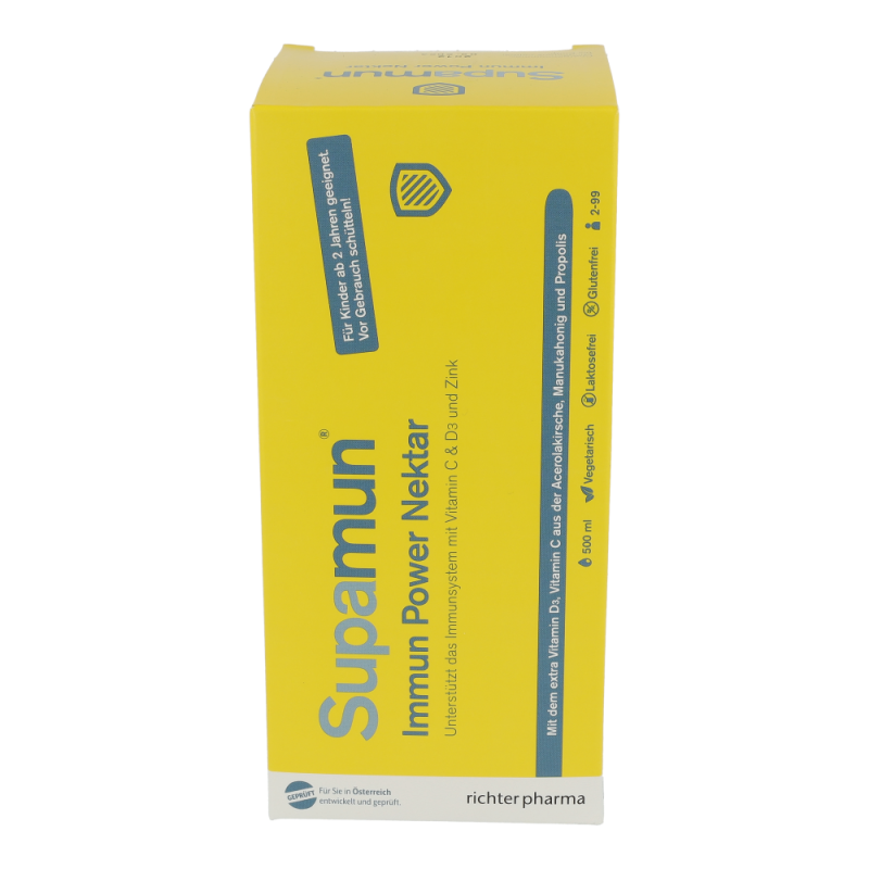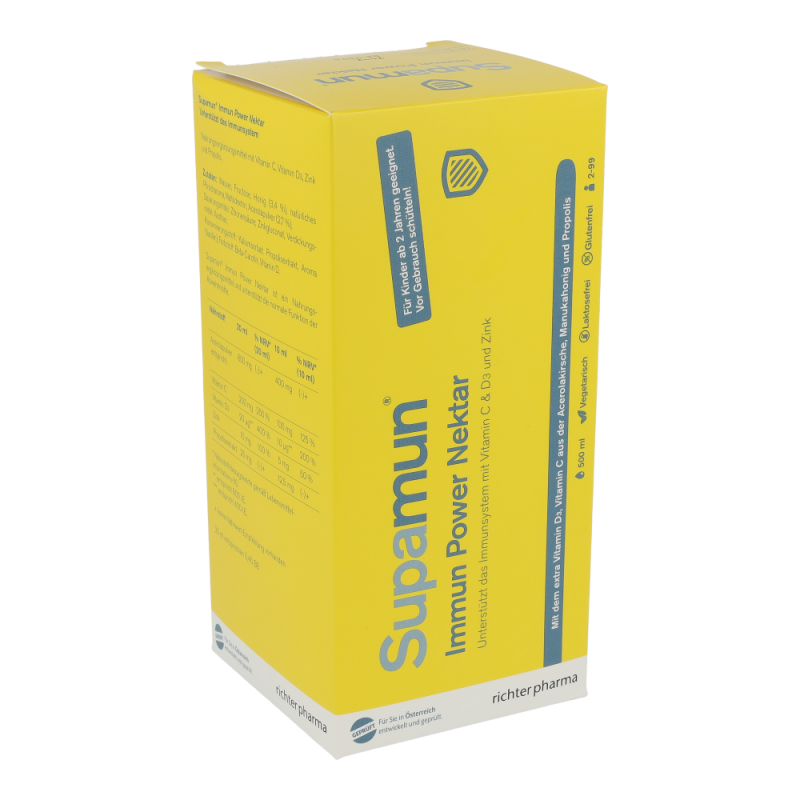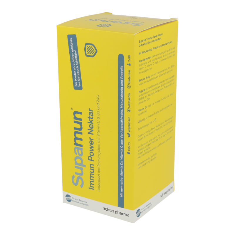 Supamun Power Nektar, nur einmal täglich eingenommen, kann durch die ausgewogene Dosierung von Vitamin C (gewonnen aus der Acerola Kirsche) und D3 sowie dem Spurenelement Zink zur normalen Funktion des Immunsystems beitragen. Außerdem enthält Supamun Power Nektar Manuka Honig und Propolis.Steuern Sie stressbedingter Immunschwäche rechtzeitig entgegen!.