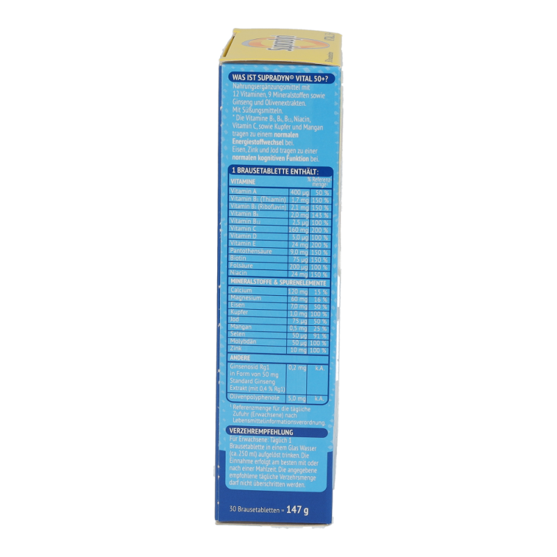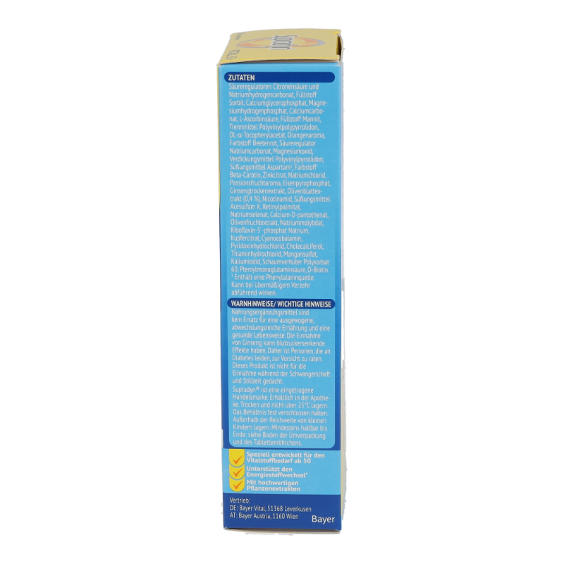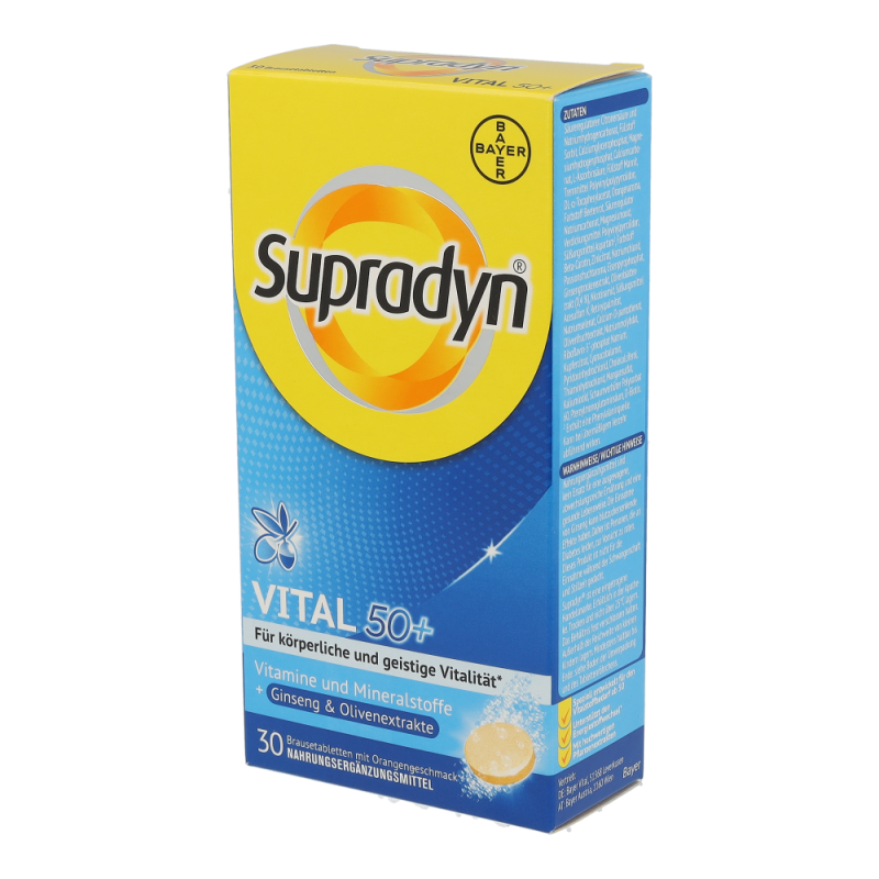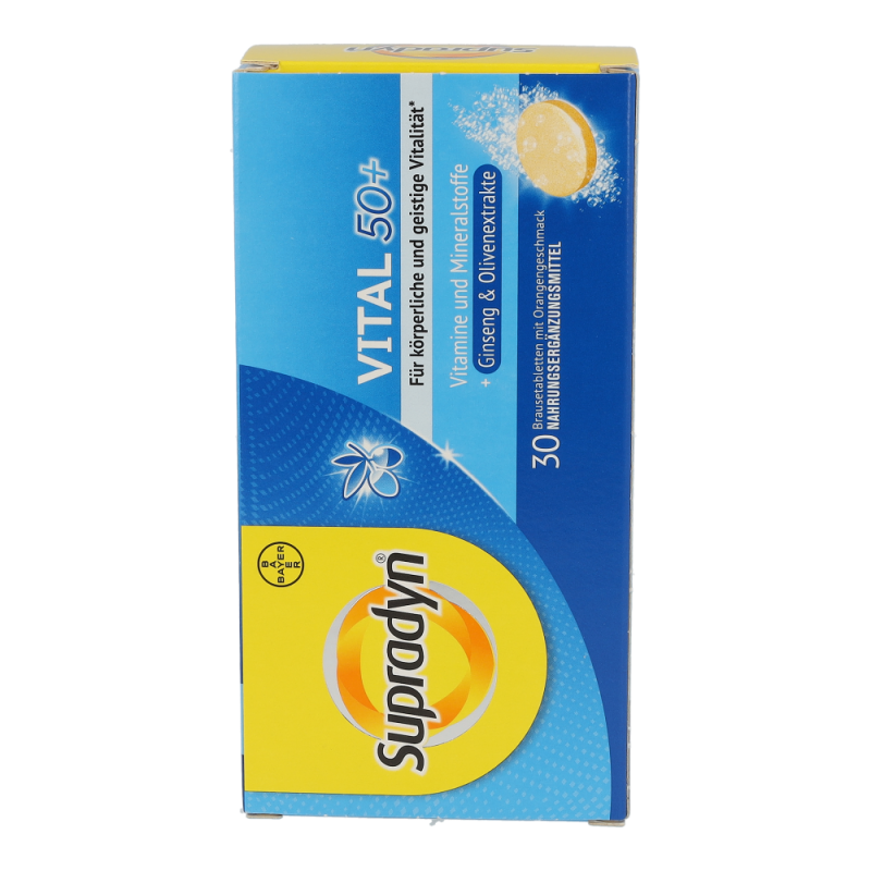 Supradyn vital 50+ Brausetabletten bestehend aus der Kombination maßgeschneiderter Vitamine sowie hochwertiger Extrakte aus der Olive und Ginseng unterstützt körperliche und geistige Vitalität im Alter. Die Antioxidantien aus der Olive tragen dazu bei, die Blutfette vor oxidativem Stress zu schützen. Die in Supradyn vital 50+ enthaltenen Vitamine, Mineralstoffe und Spurenelemente sind wichtig für Energie, Immunsystem und einen gesunden Stoffwechsel. .