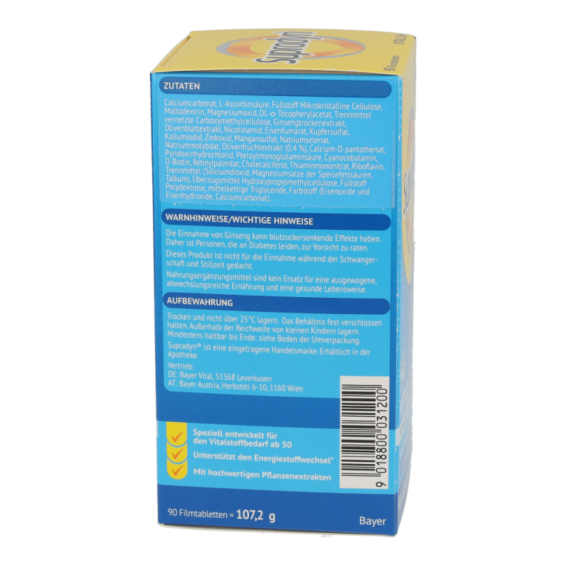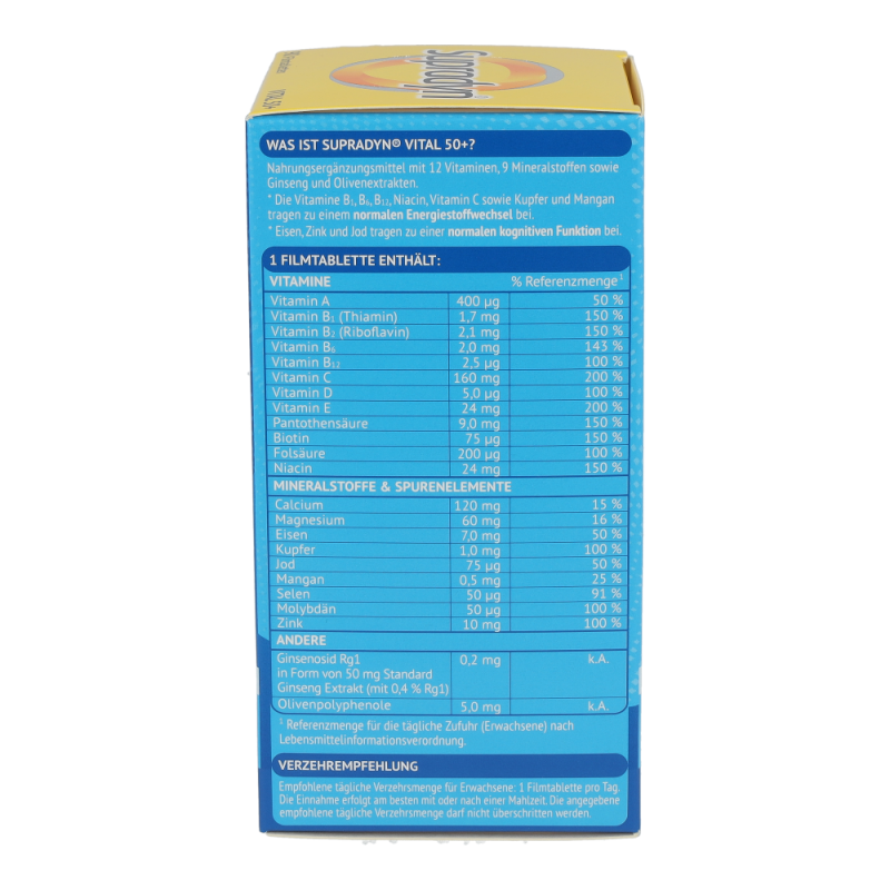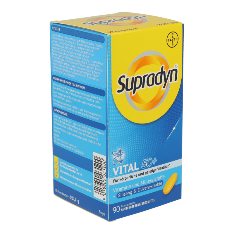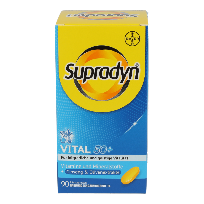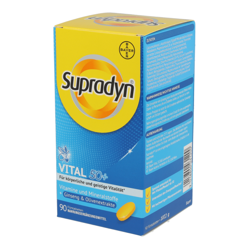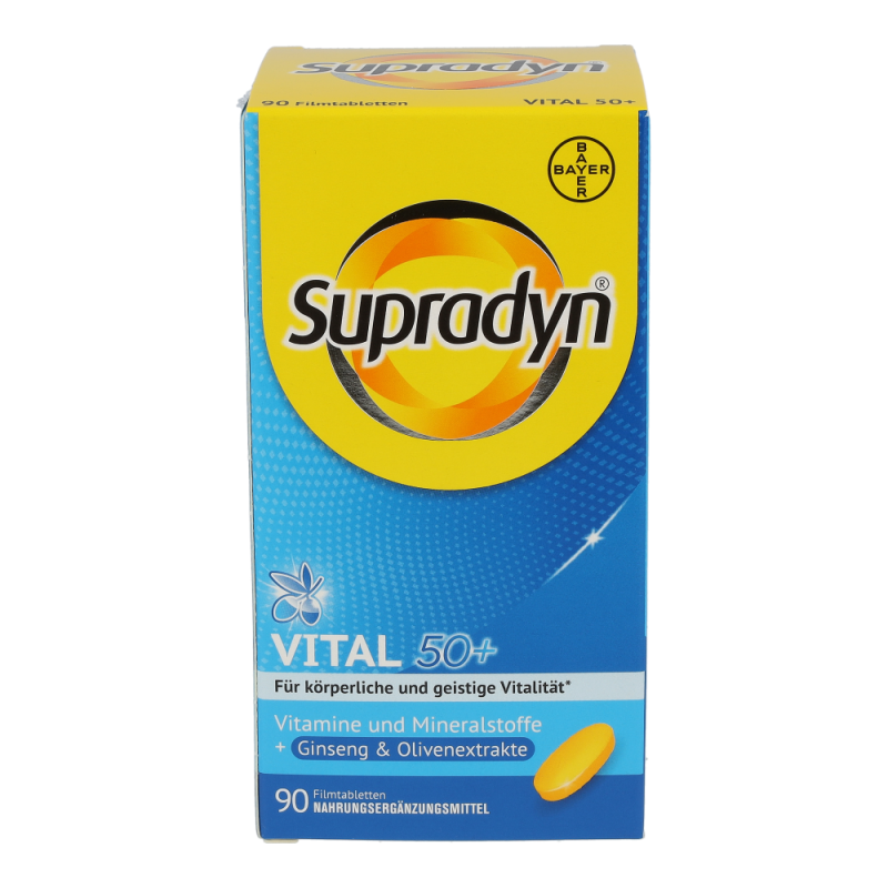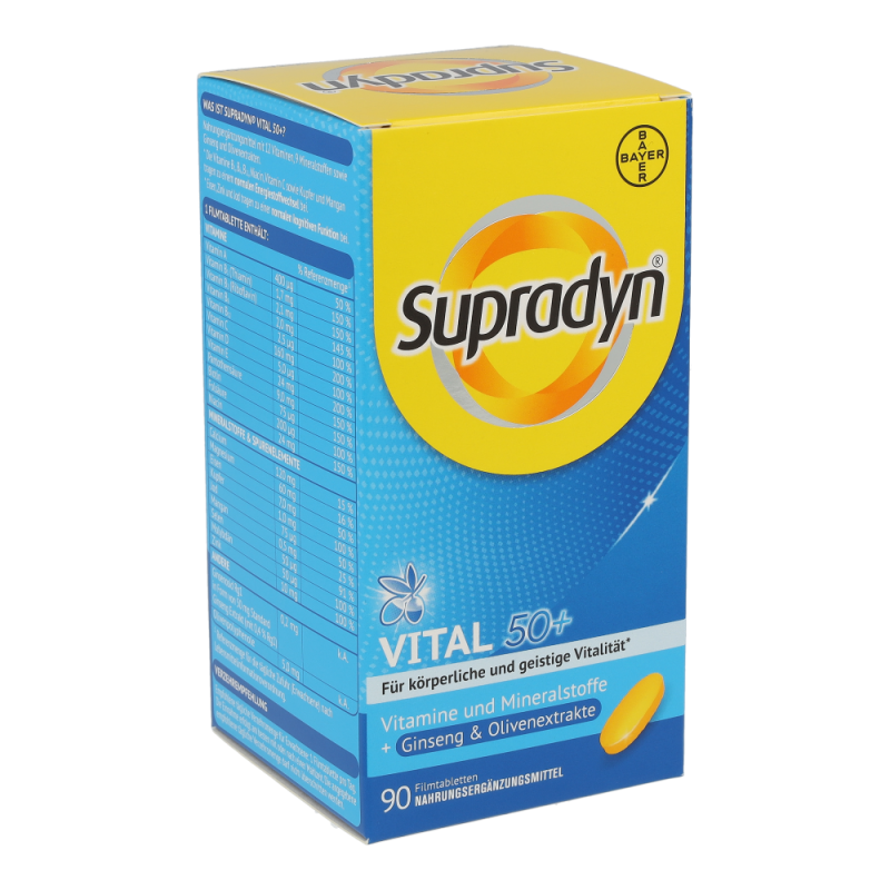 Die Kombination aus maßgeschneiderten Vitaminen sowie hochwertigen Extrakten aus der Olive und Ginseng unterstützt körperliche und geistige Vitalität im Alter. Die Antioxidantien aus der Olive tragen dazu bei, die Blutfette vor oxidativem Stress zu schützen. Die in Supradyn® vital 50+ enthaltenen Vitamine, Mineralstoffe und Spurenelemente sind wichtig für Energie, Immunsystem und einen gesunden Stoffwechsel.