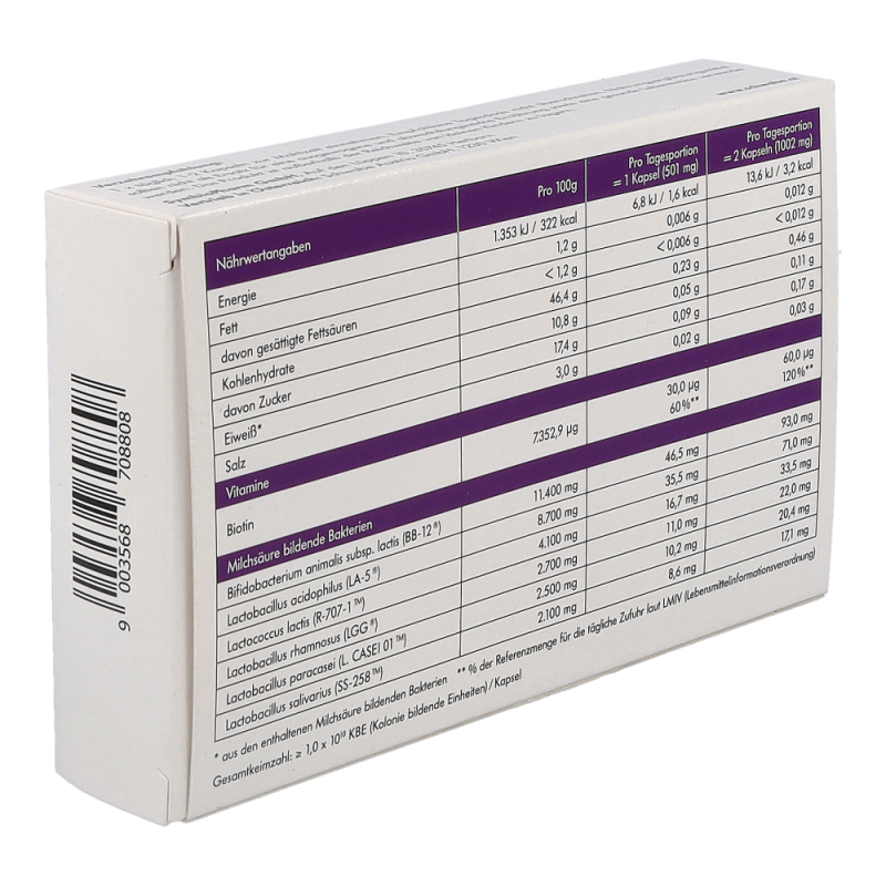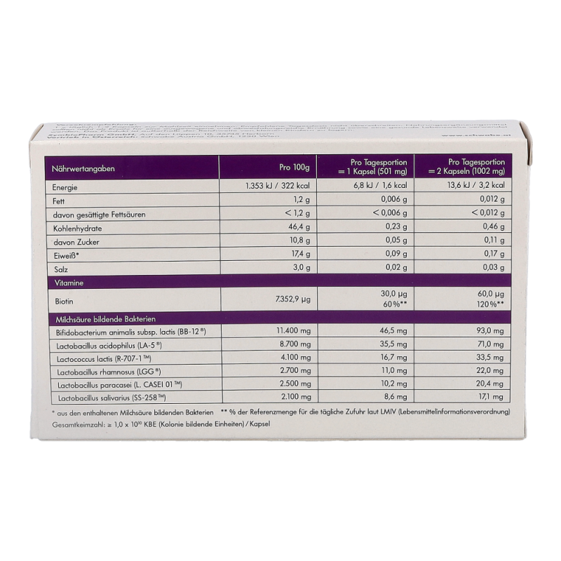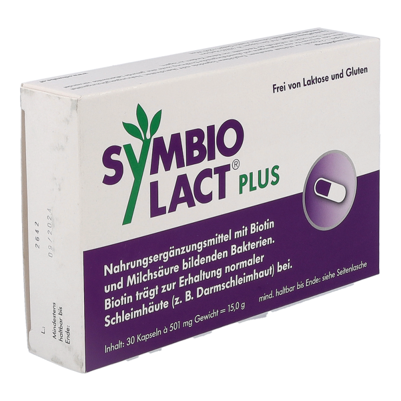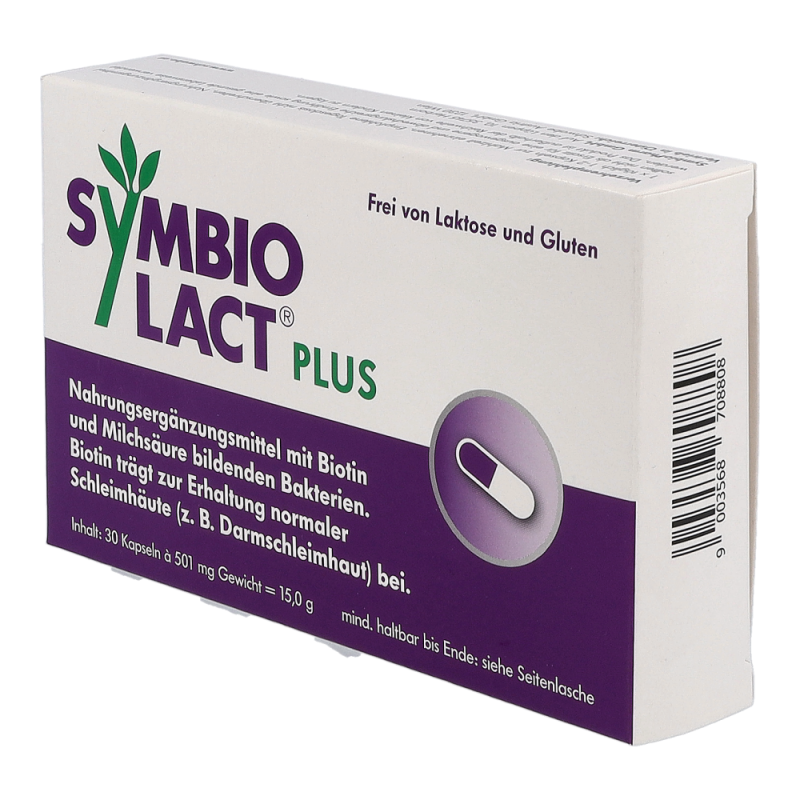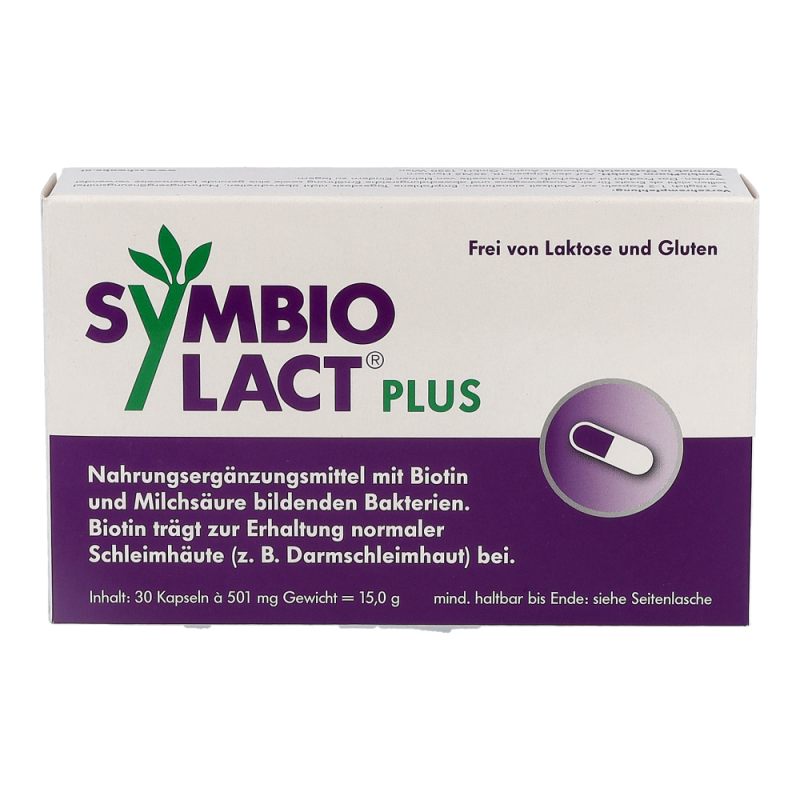 SymbioLact Plus ist ein Nahrungsergänzungsmittel mit Biotin und Milchsäure bildenden Bakterien. Die innovative, vegetarische Kapsel enthält sechs Stämme Milchsäurebakterien in höchster Konzentration für den gesamten Darmtrakt. Das zusätzlich enthaltene Vitamin Biotin unterstützt die normale Funktion der Darmschleimhaut.