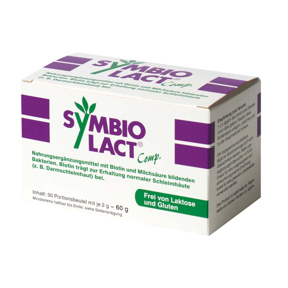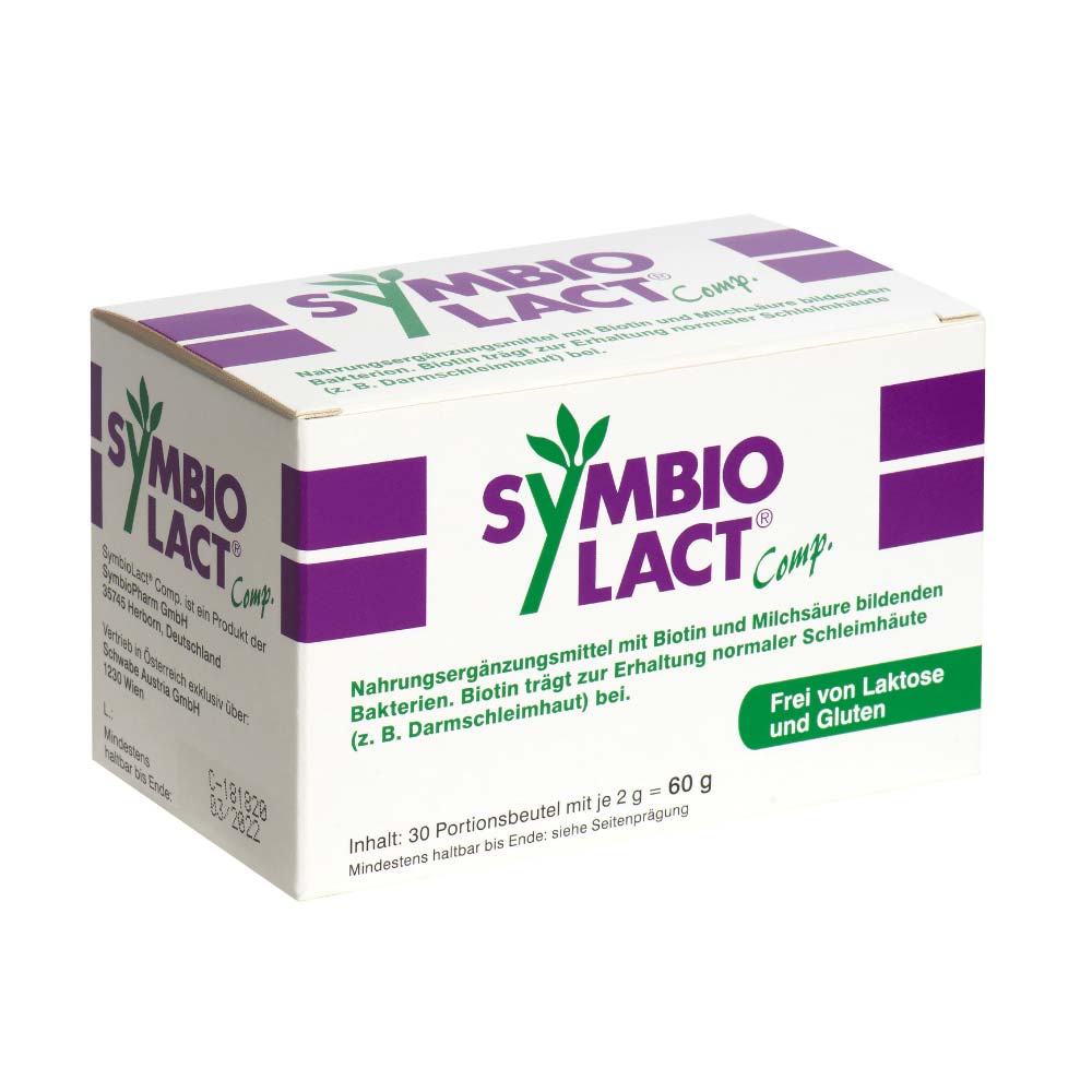 Symbiolact Pulver Comp. Beutel ist ein Nahrungsergänzungsmittel, das Biotin und verschiedene Stämme Milchsäure bildender Bakterien enthält. Diese Bakterien gehören zu den Vertretern der Darmflora. Biotin ist ein wasserlösliches Vitamin und spielt für den Stoffwechsel der Körperzellen eine wichtige Rolle. Gerade sehr aktive Gewebe wie die Schleimhäute des Körpers benötigen Biotin, damit Zellteilungsprozesse geregelt ablaufen können.