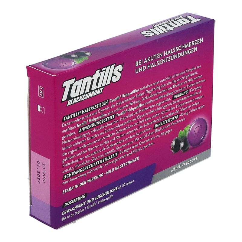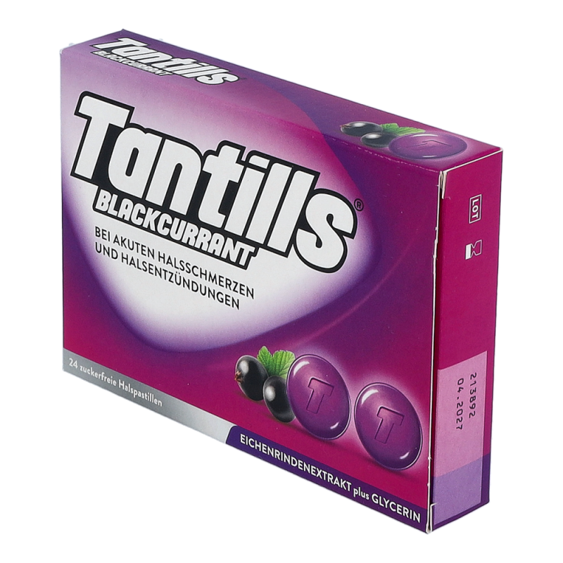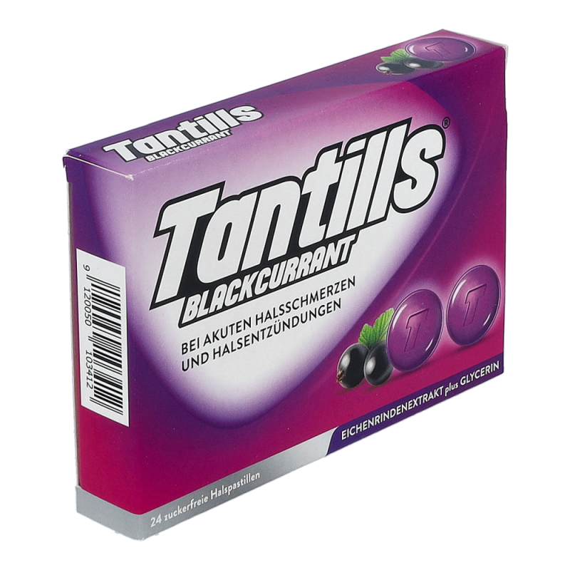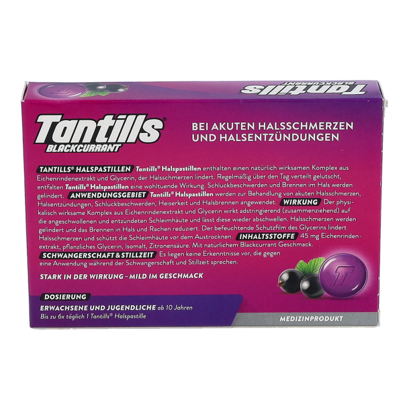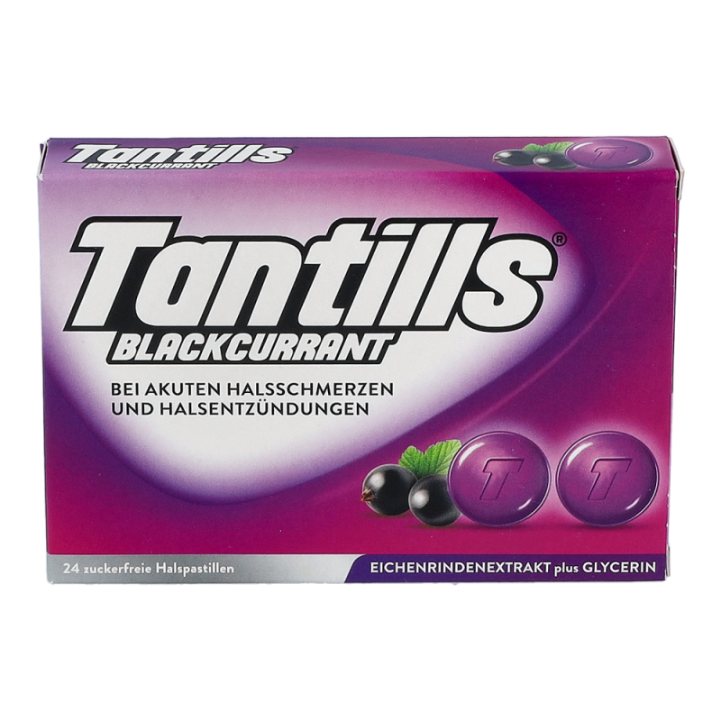 Tantills® Halspastillen Blackcurrant 24 Stk. enthalten einen Wirkkomplex aus Eichenrindenextrakt und pflanzlichem Glycerin, der Halsschmerzen natürlich lindert. Diese einzigartige Kombination wirkt auf die angeschwollenen und entzündeten Schleimhäute und lässt diese wieder abschwellen.