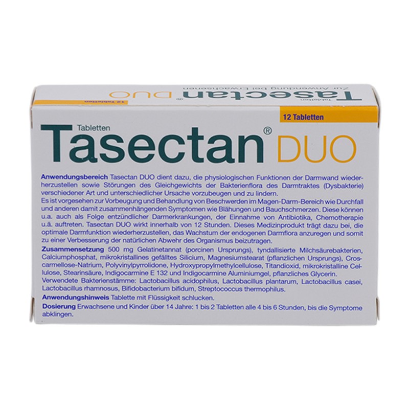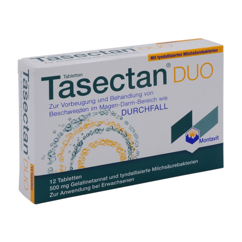 Tasectan® DUO Erwachsene Tabletten 500 mg 12 Stk. stoppt akuten Durchfall und stärkt die Abwehrkraft des Darms. Es enthält neben Gelatinetannat, das die Darmschleimhaut schützt und für eine rasche Symptomkontrolle sorgt, eine Mischung von tyndallisierten Milchsäurebakterien. Diese stärken die Abwehrkraft des Darms und gewährleisten eine rasche Wiederherstellung der optimalen, physiologischen Darmbedingungen.
