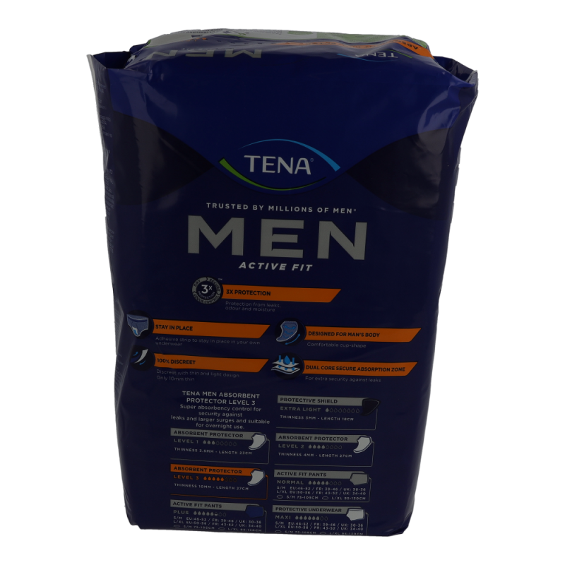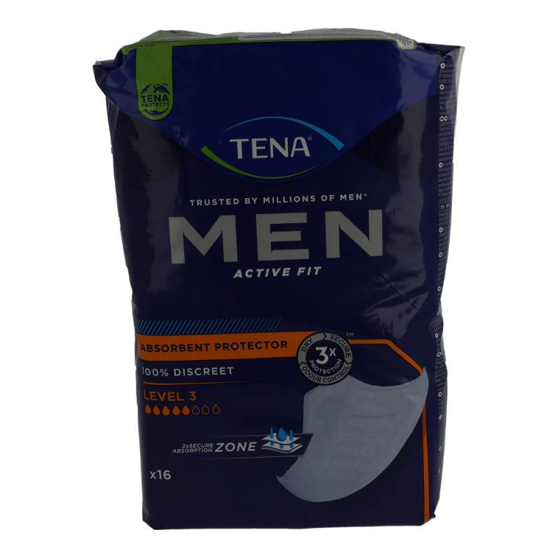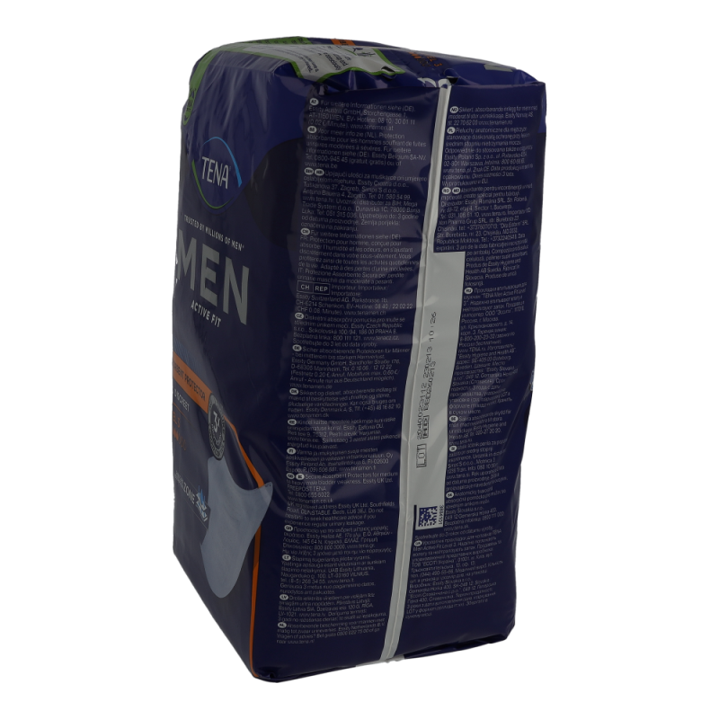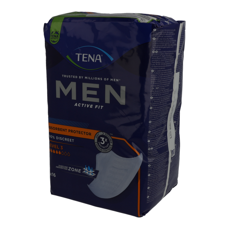 TENA Men – speziell für Männer entwickelte Einlagen, für leichte bis mittlere Blasenschwäche. Überzeugen Sie sich von den speziell an die männliche Anatomie angepassten TENA Men Produkten. Dank ihrer Passform und des speziellen Geruchsschutzes ist TENA Men ganz besonderes diskret.Perfekter Sitz durch die speziell auf die männliche Anatomie abgestimmte Schalenform. Länger trocken, länger sicher durch doppeltem Saugkern: Schnellere Aufnahme der Flüssigkeit, höhere Trockenheit durch weniger Rücknässung. Das Plus an Diskretion durch den Geruchsbinder Odour Control™, der Gerüche verhindert, bevor sie entstehen. Hautfreundlich dank der atmungsaktiven Rückseite. Ideal, auch für unterwegs durch die hygienische Einzelverpackung. Optimaler Sitz, sichere Fixierung durch den extra-breiten Klebestreifen.
