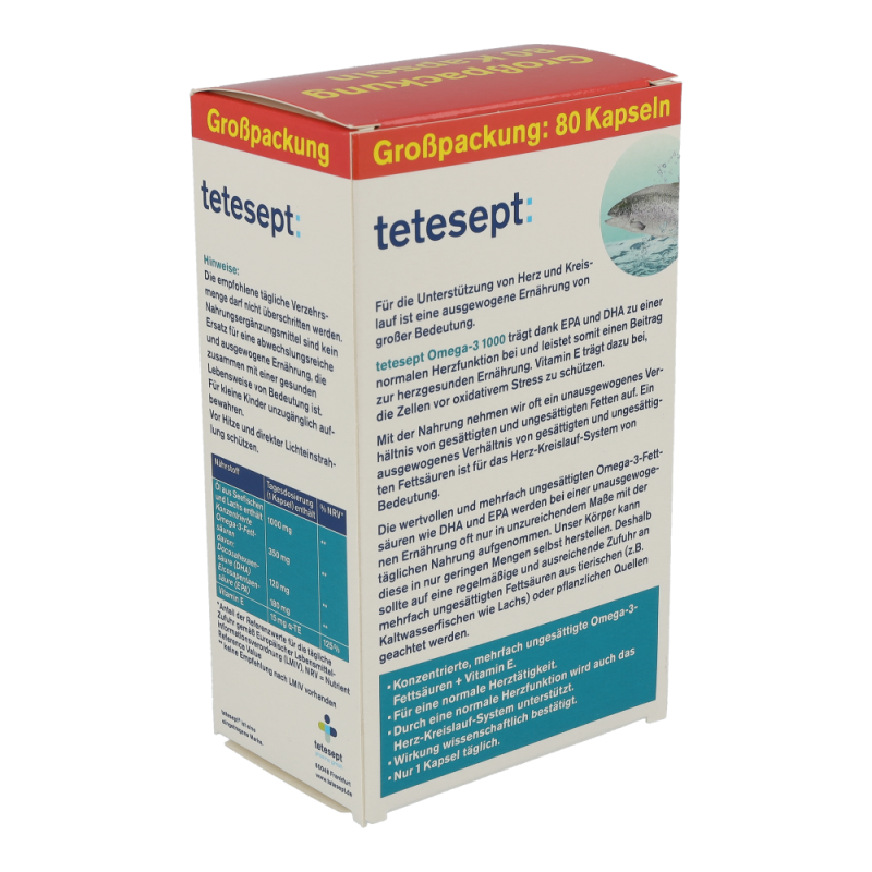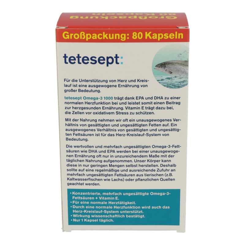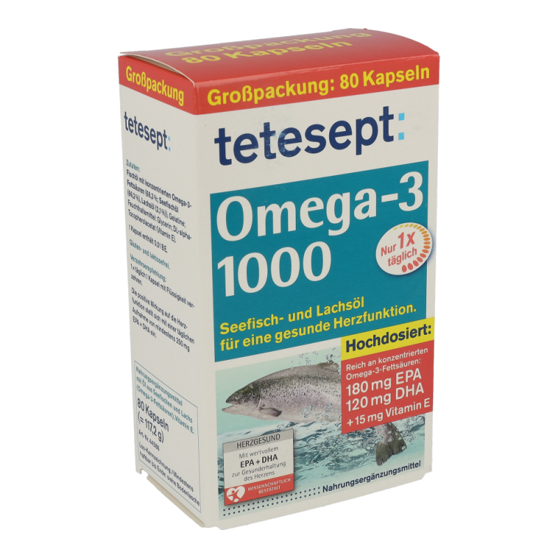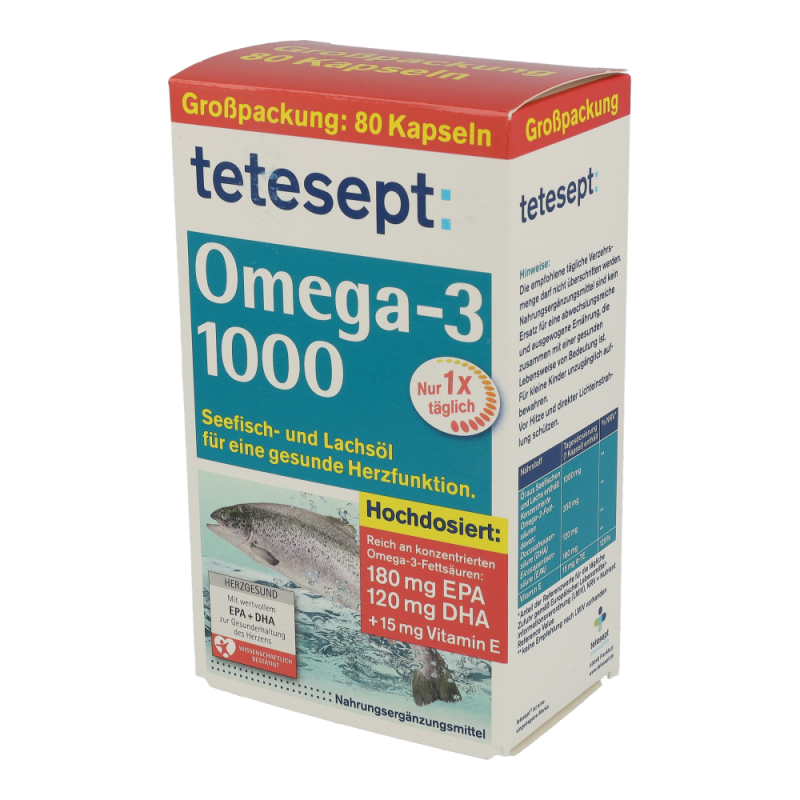 Tetesept Omega-3 1000 Kapseln dienen einer herzgesunden Ernährung. Das enthaltene Vitamin E unterstützt den Abbau freier Radikale und hilft dadurch Gefäße und Zellen gesund zu erhalten.