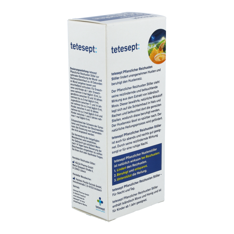 Tetesept Pflanzlicher Reizhusten Stiller legt sich wie ein sanfter Balsam auf die gereizte Schleimhaut, wodurch diese beruhigt wird. Der lästige Hustenreiz wird spürbar gelindert und die Schleimhaut zudem länger befeuchtet..