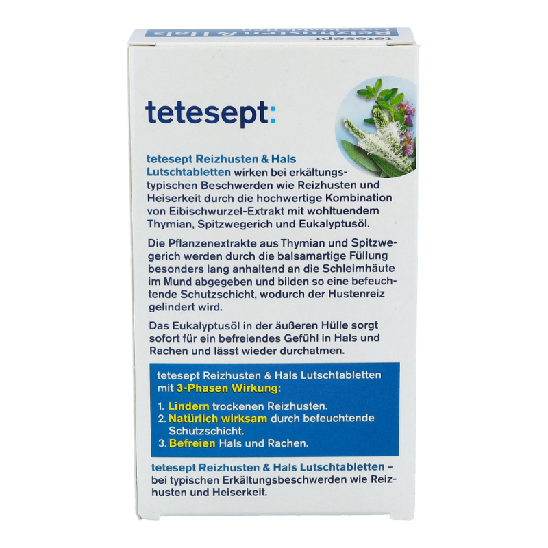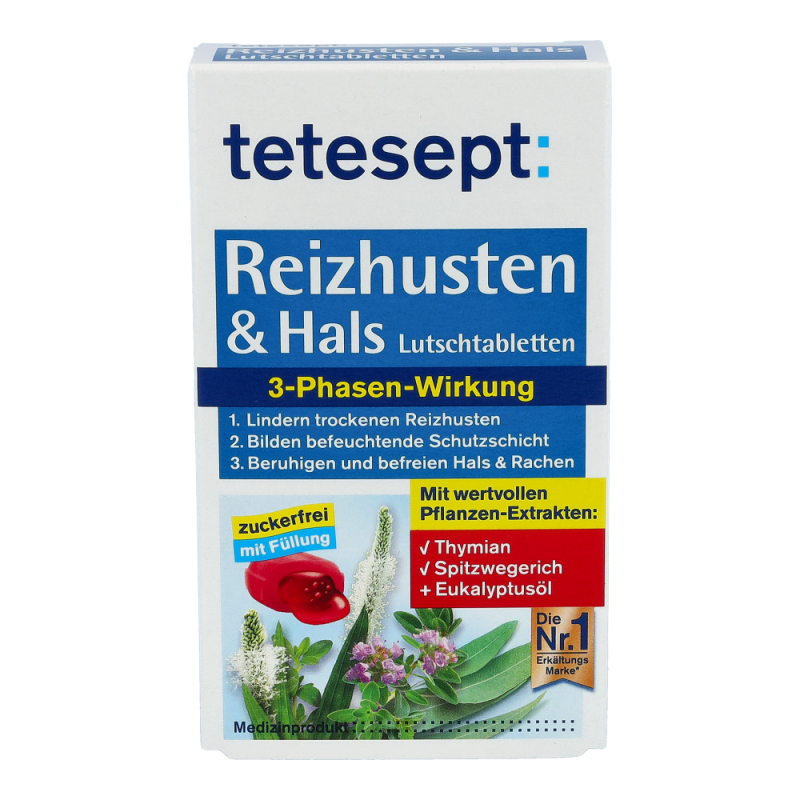Tetesept Reizhusten und Hals Lutschtabletten wirken in drei Phasen linderns bei Husten, Heiserkeit und leichten Halsschmerzen.