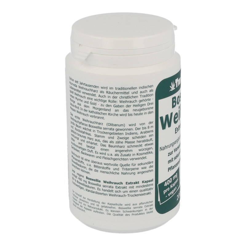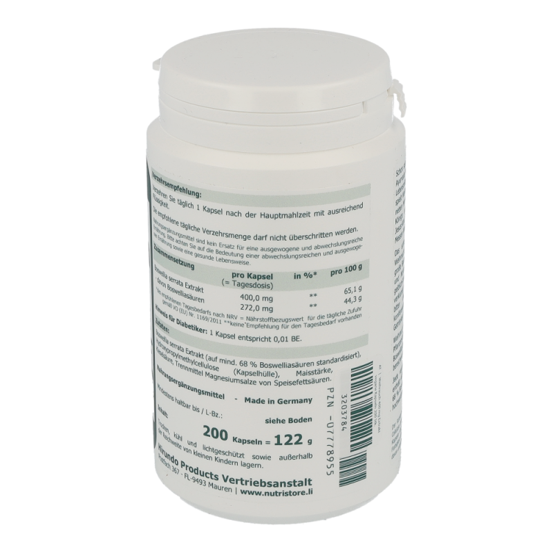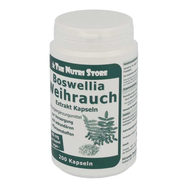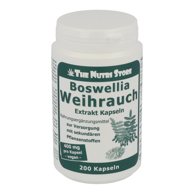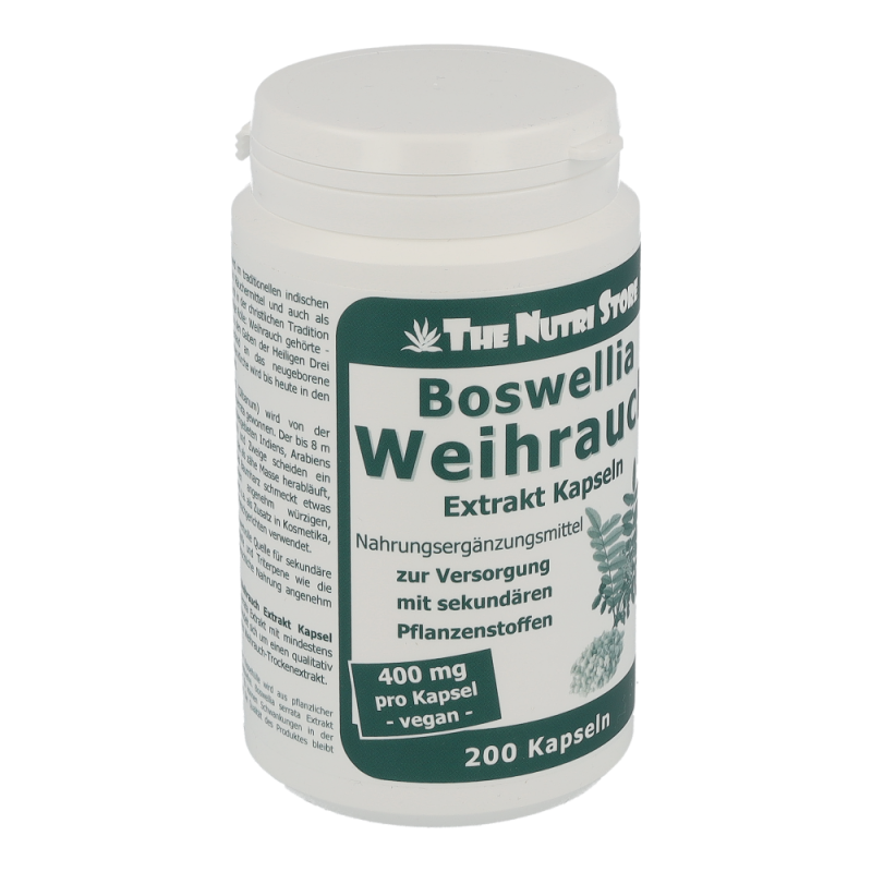 The Nutri Store Boswellia Weihrauch Extrakt Kapseln 400 mg enthalten 400 mg Boswellia serrata Extrakt mit mindestens 65 % Boswelliasäuren. Es handelt sich um einen qualitativ hochwertigen, standardisierten Trockenextrakt aus indischem Weihrauch.