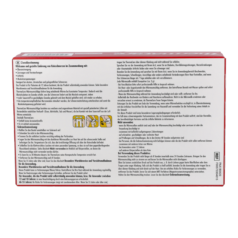 • ThermaCare Knie Wärmeumschläge eignen sich besonders zur Behandlung von Knieschmerzen und Muskelsteifheit. Dieses Produkt besteht aus 12 patentierten Wärmezellen mit einer ergonomischen und flexiblen Form, die sich perfekt an Ihr Knie anpasst.