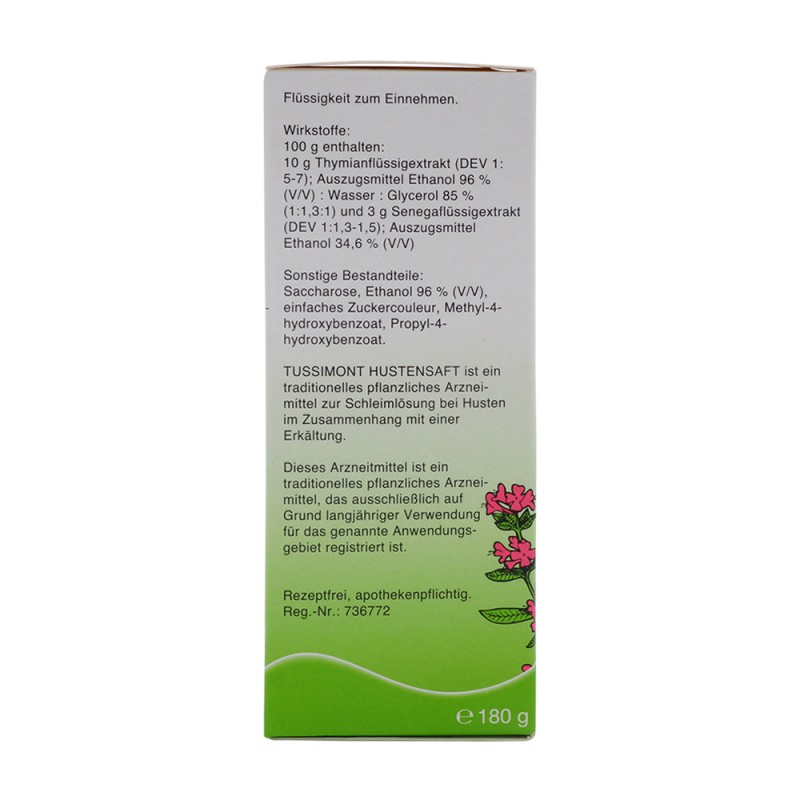 Tussimont Hustensaft verflüssigt zähen und gestauten Bronchialschleim, beschleunigt das Abhusten des Sekrets und lindert den Hustenreiz. Die Fluidextrakte von Thymianblättern und Senegawurzeln wirken schleimlösend, krampflösend und schleimfördernd. Das ätherische Thymianöl des Extraktes besitzt zusätzlich desinfizierende (antimikrobielle) Wirkung und beeinflusst vorteilhaft Magen- und Darmtrakt.