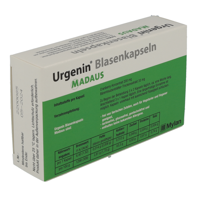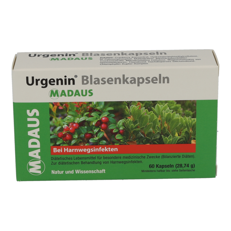 Für gesunde Harnwege – rein pflanzlich mit Bärentraubenblättern und Cranberry. Bei Neigung zu Blasenproblemen können Urgenin Blasenkapseln zur Reinigung der Harnwege beitragen, indem sie unerwünschte Keime aus dem Harnsystem entfernen. Unterstützend ist auf eine ausreichende Trinkmenge zu achten (kein Alkohol, kein Koffein, keine Kohlensäure). Bärentraubenblätter-Extrakt, Cranberrykonzentrat