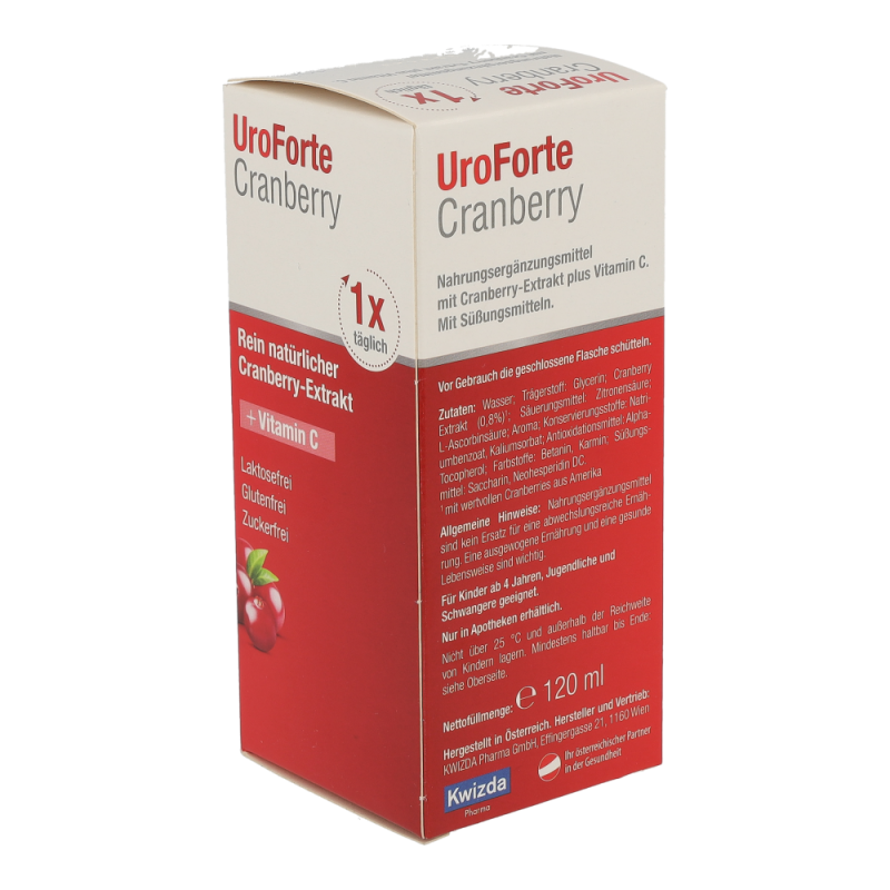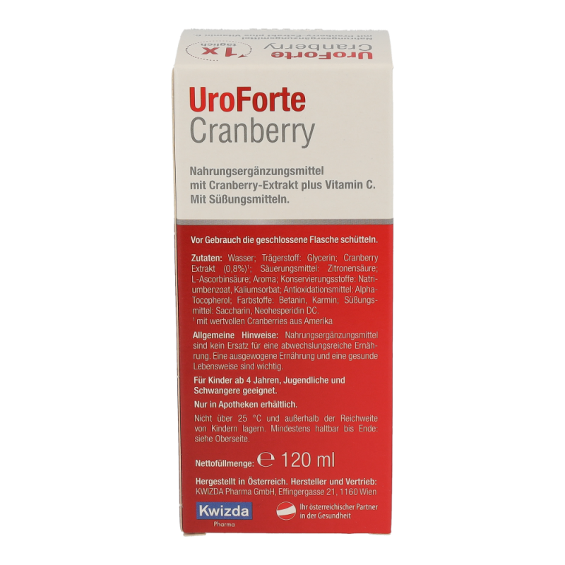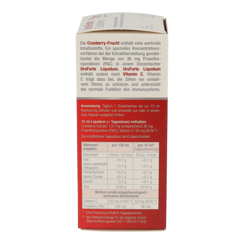 BIOGELAT® UroForte Cranberry Liquidum Nahrungsergänzungsmittel mit Cranberry-Extrakt plus Vitamin C. Mit Süßungsmitteln. Vitamin C unterstützt Ihr Immunsystem. 15 ml Liquidum (= Tagesempfehlung) enthalten: 120 mg Cranberry-Extrakt, entsprechend 36 mg Proanthocyanidine (PAC) 50 mg Vitamin C (63%**) ** des Nährstoffbezugswertes (VO EU 1169/2011) BIOGELAT® UroForte Cranberry Liquidum ist ein Nahrungsergänzungsmittel, das dazu bestimmt ist die tägliche Ernährung mit einem hochwertigen Extrakt aus der Cranberry-Frucht und Vitamin C gezielt zu ergänzen. Die Cranberry-Frucht enthält viele wertvolle Inhaltsstoffe. Nur in Apotheken erhältlich. Nicht über 25 °C und für Kinder unerreichbar lagern. Haltbarkeit nach 1. Öffnen: 4 Wochen Weitere Produkte: BIOGELAT® UroForte Cranberry Filmtabletten BIOGELAT® UroForte Cranberry Granulat BIOGELAT® UroForte Cranberry plus Birke Granulat Hersteller und Vertrieb: Kwizda Pharma GmbH, Effi ngergasse 21, 1160 Wien www.kwizda-otc.at www.gesunde-blase.at Stand der Information: Februar 2019 13203_13_AT 764 Pharmacode 764 Pharmacode 764 526264_Packz.pdf 2 05. 03. 2019 09:07:12 Ein spezielles Konzentrationsverfahren bei der Extraktherstellung gewährleistet die Menge von 36 mg Proanthocyanidinen (PAC) in einem Dosierbecher BIOGELAT® UroForte Cranberry Liquidum. BIOGELAT® UroForte Cranberry Liquidum enthält zudem Vitamin C. Vitamin C trägt dazu bei, die Zellen vor oxidativem Stress zu schützen und unterstützt die normale Funktion des Immunsystems. Nährwertangaben pro 100 ml pro 15 ml Liquidum* (= Tagesempfehlung) Brennwert 150 kJ/35 kcal 23 kJ/5 kcal Fett davon gesättigte Fettsäuren < 0,1 g < 0,1 g < 0,1 g < 0,1 g Kohlenhydrate davon Zucker < 0,5 g < 0,1 g < 0,1 g < 0,1 g Eiweiß 0,2 g < 0,1 g Salz 0,05 g < 0,01 g Weitere ernährungsphysiologisch wirksame Bestandteile: Vitamin C 333 mg (416%**) 50 mg (63%**) Cranberry PAC 240 mg 36 mg * Eine Packung enthält 8 Tagesportionen (Packungsgröße 120 ml) bzw. 13 Tagesportionen (Packungsgröße 200 ml). ** der Referenzmenge für die tägliche Zufuhr (Nährstoffbezugswert (VO 1169/2011/EU)) Anwendung: Täglich 1 Dosierbecher bis zur 15 ml-Markierung befüllen und entweder pur oder in einem Glas Wasser aufgelöst trinken. Vor Gebrauch die geschlossene Flasche schütteln. Achten Sie zusätzlich auf eine ausreichende Flüssigkeits zufuhr von insgesamt 1,5 bis 2 Liter pro Tag. Für Kinder ab 4 Jahren, Jugendliche und Schwangere geeignet. Zutaten: Wasser; Trägerstoff: Glycerin; Cranberry Extrakt (0,8%)1 ; Säuerungsmittel: Zitronensäure; L-Ascorbinsäure; Aroma; Konservierungsstoffe: Natriumbenzoat, Kaliumsorbat; Antioxidationsmittel: Alpha-Tocopherol; Farbstoffe: Betanin, Karmin; Süßungsmittel: Saccharin, Neohesperidin DC. 1mit wertvollen Cranberries aus Amerika Laktosefrei, glutenfrei, zuckerfrei. Allgemeine Hinweise: Nahrungsergänzungsmittel sind kein Ersatz für eine abwechslungsreiche Ernährung. Eine ausgewogene Ernährung und eine gesunde Lebensweise sind wichtig. Die angegebene empfohlene Tagesdosis nicht überschreiten. Die Marke BIOGELAT® ist ein seit 1988 im Bereich Arzneimittel und Nahrungsergänzungsmittel geschütztes Warenzeichen der Firma Kwizda Pharma GmbH und stellt keinen Hinweis dar, dass das gegenständliche Produkt aus biologischer Landwirtschaft stammt oder nur aus ökologisch/biologisch produzierten Bestandteilen zusammengesetzt ist.