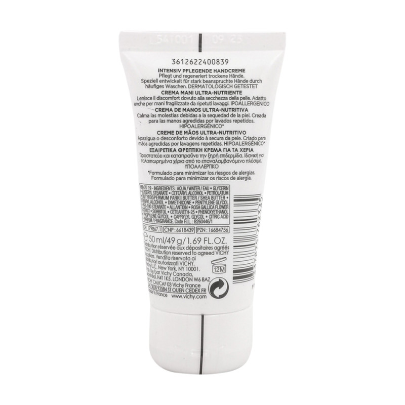 VICHY Intensiv Pflegende Handcreme wurde für durch häufiges Waschen & Desinfizieren beanspruchte Hände entwickelt. Die Formel mit Allantoin stärkt und schützt die Haut und fördert die Hautregeneration. Mit Sheabutter mildert die Handcreme für trockene Hände Spannungsgefühle und schützt die Haut vor Feuchtigkeitsverlust. Dank Vulkanischem Wasser wird die Haut geschützt und die Hautschutzbarriere gestärkt. Die Intensiv Pflegende Handcreme ist ideal für strapazierte Hände geeignet.
