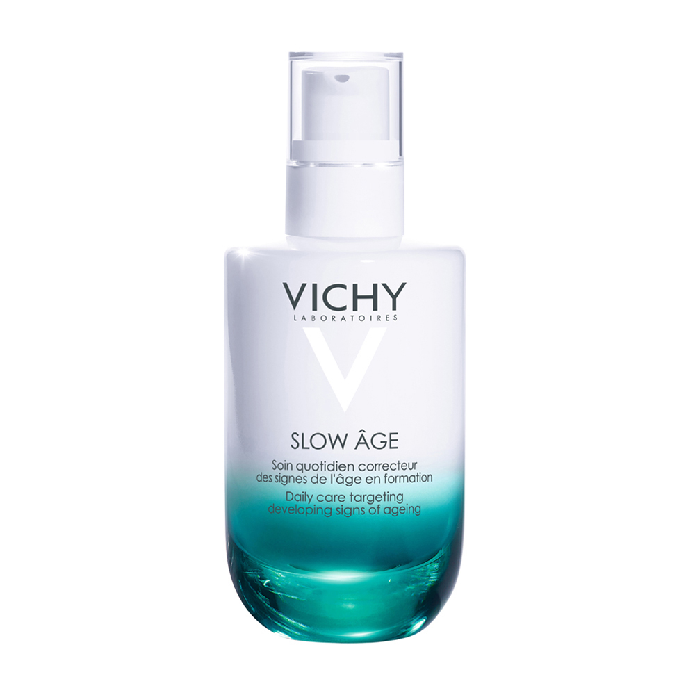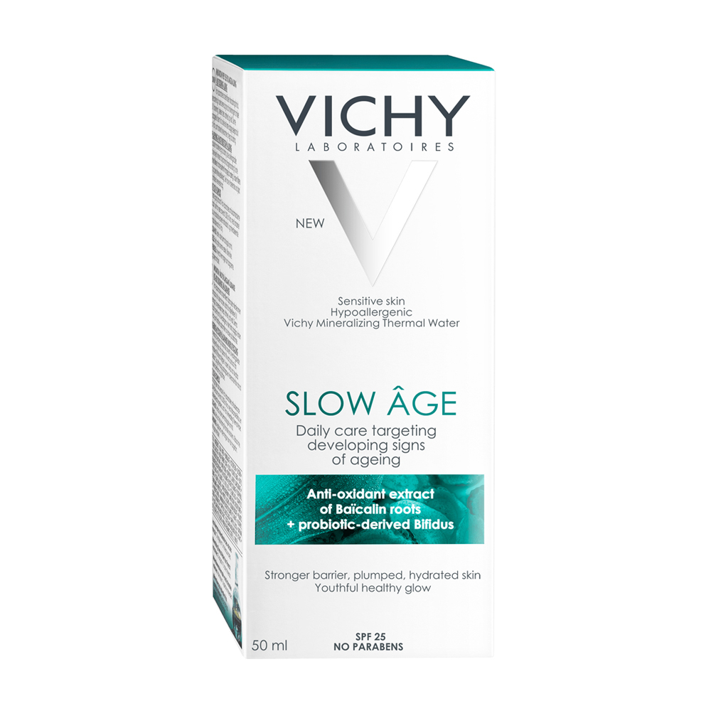 VICHY Slow Âge Fluid ist eine täglich stärkende Tagespflege mit LSF 25 und Thermalwasser von Vichy gegen Hautalterungszeichen in ihrer Entstehung. Mit Bifidus-Probiotikum und Baicalinwurzel für eine optimal geschützte Haut vor freien Radikalen. Die Haut wird gestärkt und optimal mit Feuchtigkeit versorgt – für eine jugendlich und gesund aussehende Haut. Verträglichkeit dermatologisch getestet. Für empfindliche Haut geeignet -Produkte von Vichy