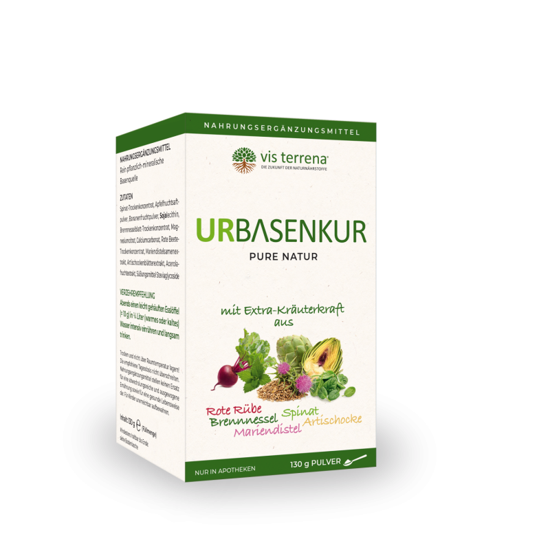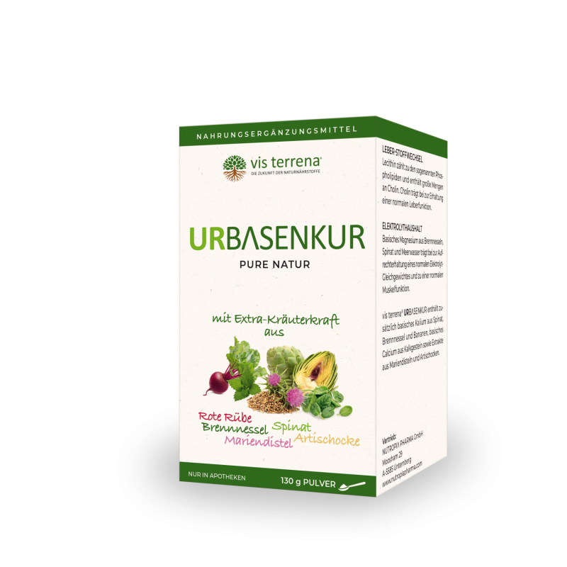 vis terrena® UR Basenkur 130 g fördert den Leberstoffwechsel einerseits durch rein natürliche basische Mineralstoffe andererseits auch durch Cholin, Betain aus der Roten Beete, Mariendistel und Artischocke. Zusätzlich wird der Säure-Basen-Haushalt durch pflanzliches Kalium aus Spinat, Brennnesseln und Bananen, natürliches Magnesium aus Meerwasser und durch mineralisch-basisches Calcium aus Kalkgestein unterstützt.