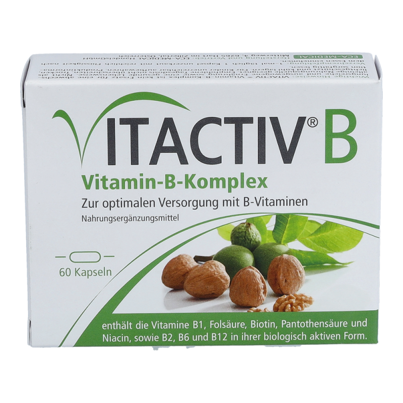 Vitactiv B Vitamin-B-Komplex dient zur optimalen Versorgung mit B-Vitaminen. Der Kamplex enthält die Vitamine B1, Folsäure, Biotin und Pantothensäure sowie B2, Niacin, B6 und b12 in ihrer biologisch aktiven Form. Die Vitamine des B-Komplexes haben große Bedeutung für zahlreiche Körperfunktionen und beeinflussen diese in vielerlei Hinsicht positiv. Jetzt bestellen und je 1 Tagesportion Orthomol Immun gratis erhalten!