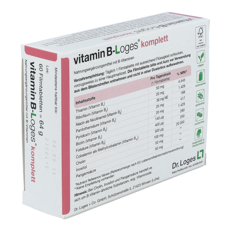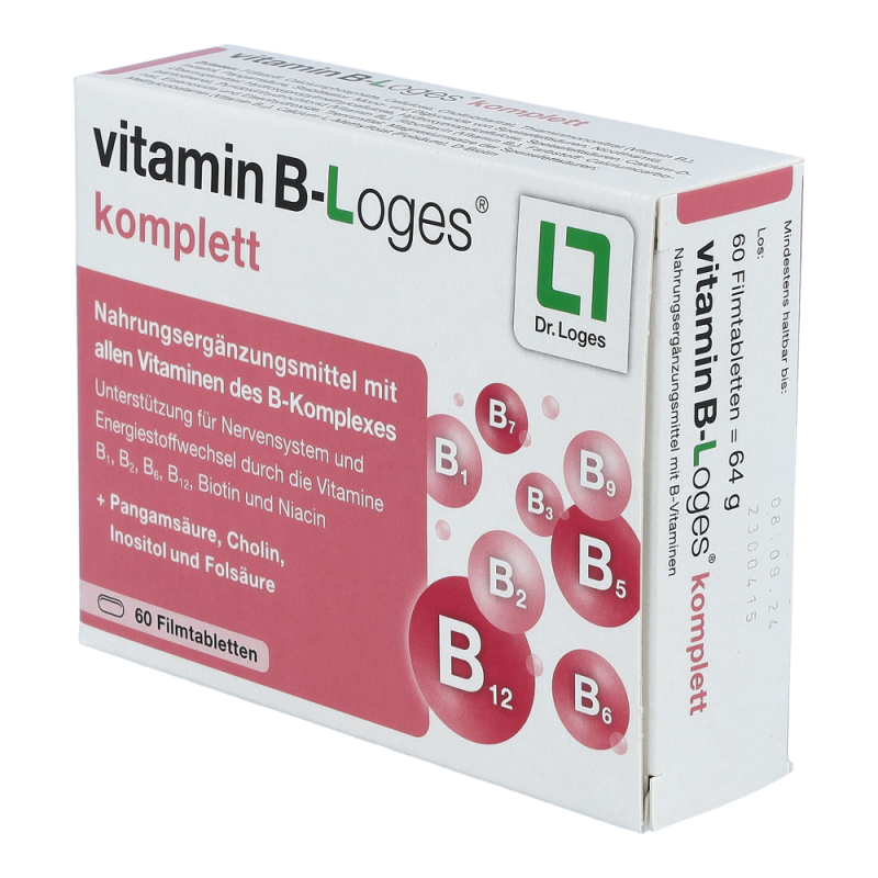 Vitamin B-Loges Komplett Filmtabletten 60 Stk. ist ein Komplett-Paket für Nervensystem und Energiestoffwechsel. Die Tabletten enthalten eine ausgewogene Kombination der B-Vitamine und komplexnaher Vitaminoide.