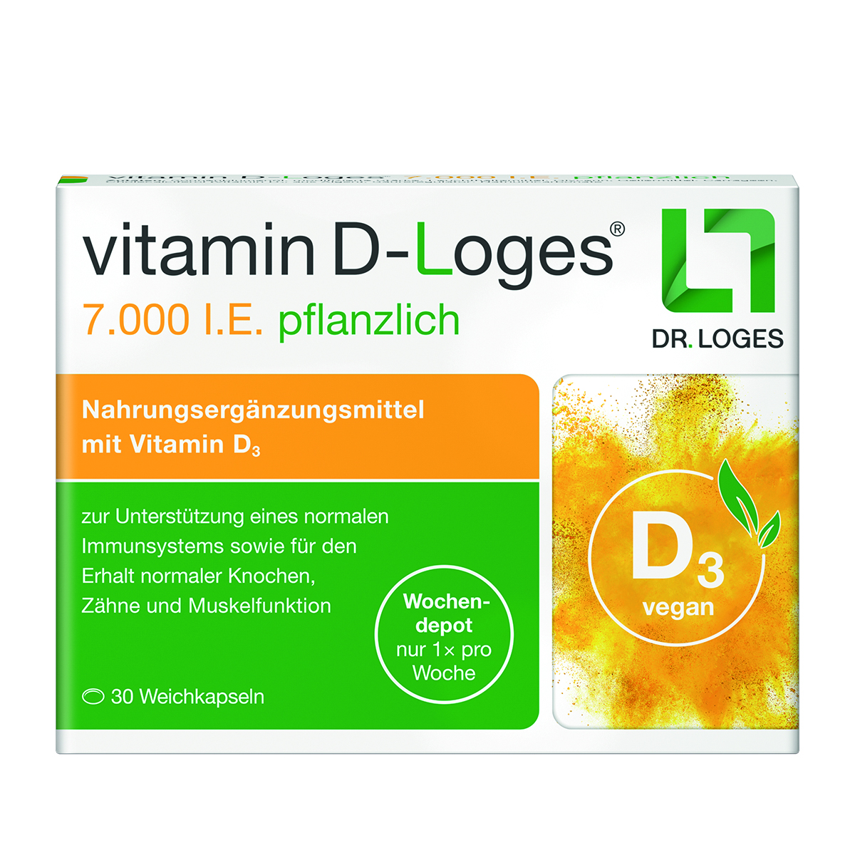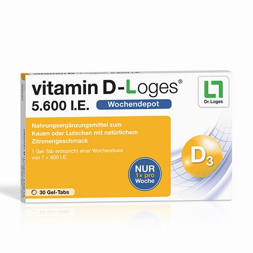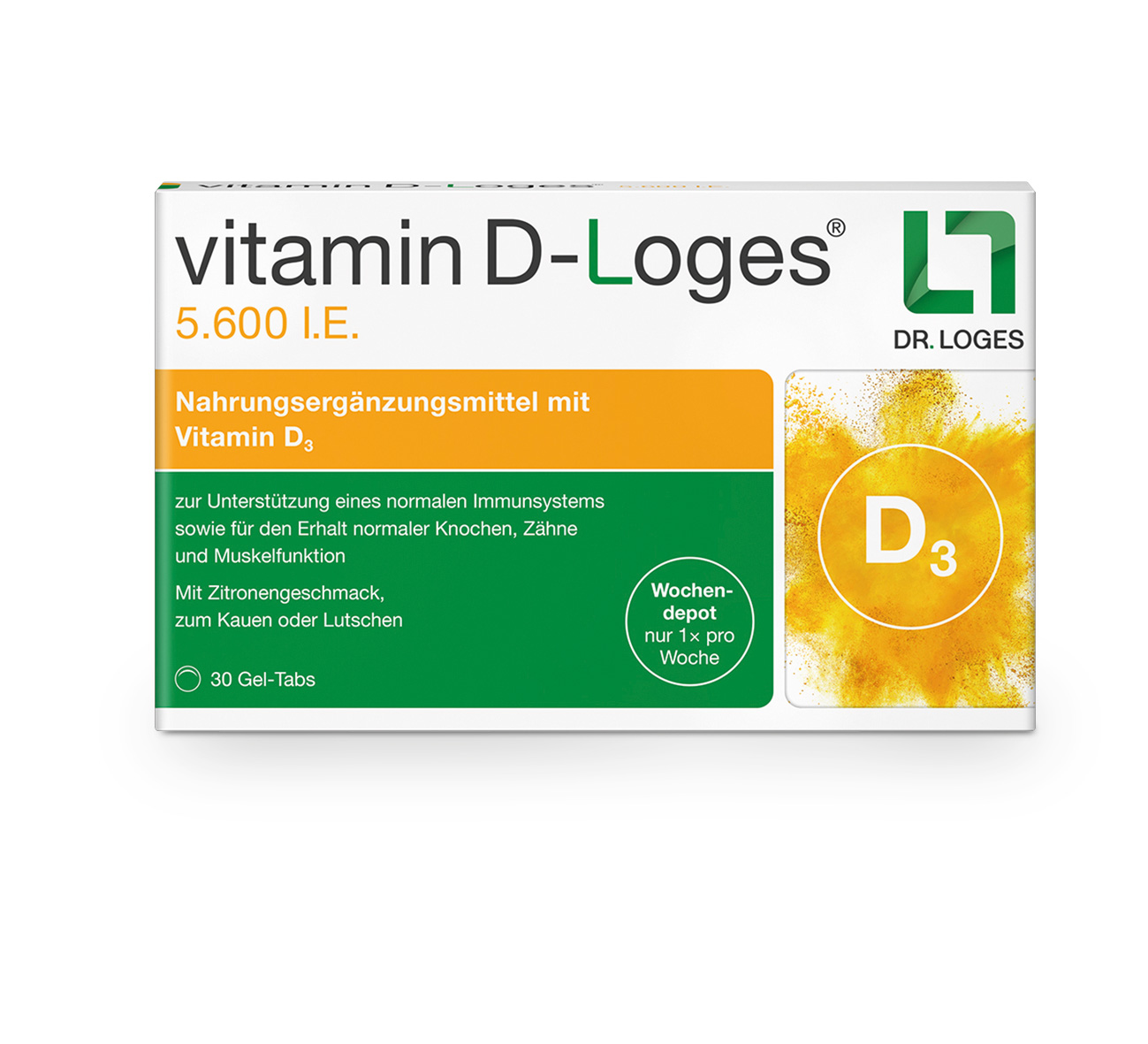 Das innovative vitamin D-Loges® 5.600 I.E. bietet diese praktische Möglichkeit. Die angenehm zitronig schmeckenden Gel-Tabs enthalten 140 µg (5.600 I.E.) Vitamin D3. Einmal wöchentlich eingenommen entspricht dies der durch die Deutsche Gesellschaft für Ernährung (DGE) empfohlenen täglichen Zufuhr von 20 μg Vitamin D3 (800 I.E.).