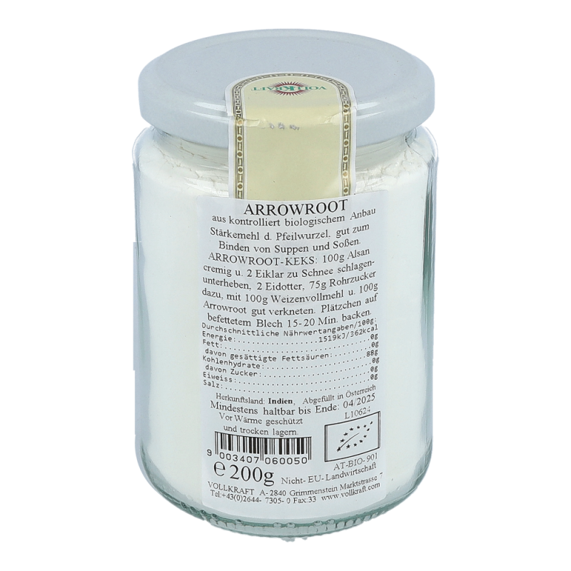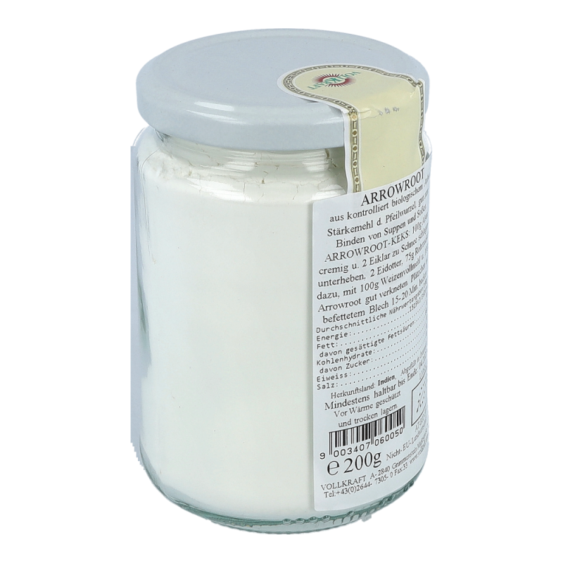 Vollkraft Arrowroot kbA stammt aus den Wurzeln einer tropischen Pflanze. Zu feinem Brei vermahlen kann Arrowroot als pflanzliches Bindemittel verwendet werden, das sich völlig von Kartoffelstärke unterscheidet.