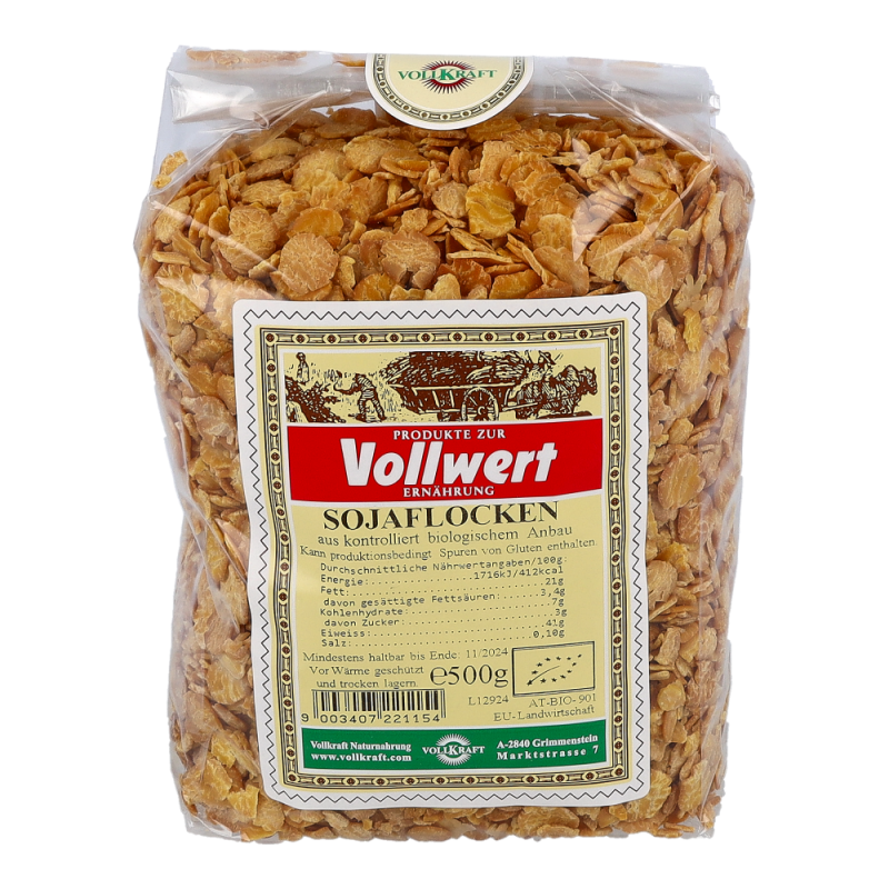 Vollkraft Sojaflocken kbA: Soja ist ein wohlschmeckendes und facettenreiches Lebensmittel, das sich aufgrund seines Gehalts an Eiweiß, der sekundären Pflanzeninhaltsstoffe, des günstigen Fettsäuremusters und der begleitenden Ballaststoffe positiv auf die Gesundheit auswirken kann. Die Flocken sind vielseitig einsetzbar und schnell zu leckeren Speisen verarbeitet.
