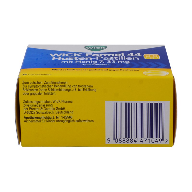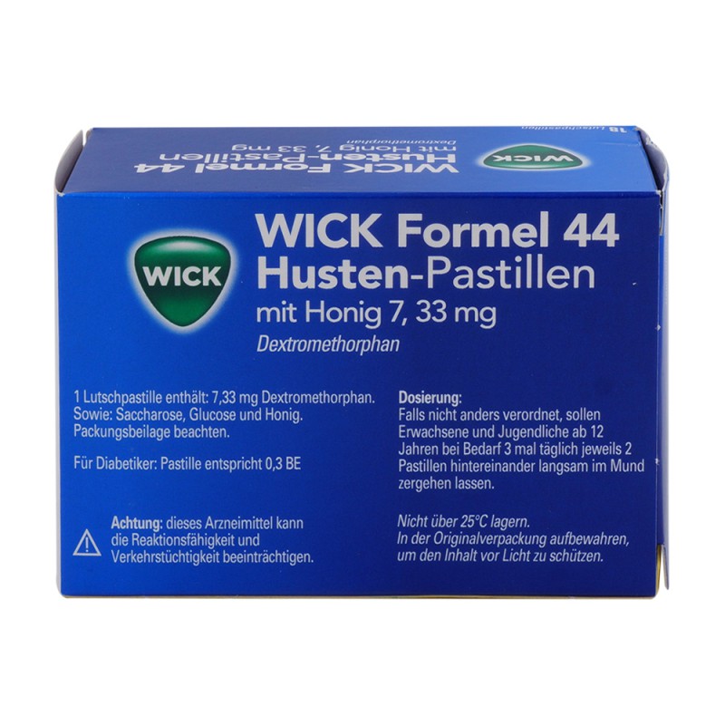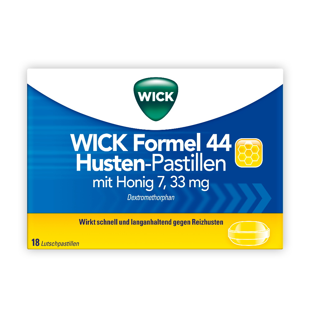 Wick Formel 44 Husten-Pastillen mit Honig dienen der symptomatischen Behandlung von trockenem Reizhusten, wie er etwa bei Erkältungen und grippalen Infekten vorkommt. Die Wirkung des Arzneimittels setzt sehr schnell ein (bereits nach 15 bis 30 Minuten) und hält bis zu 6 Stunden an.