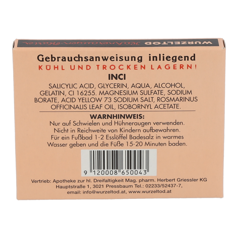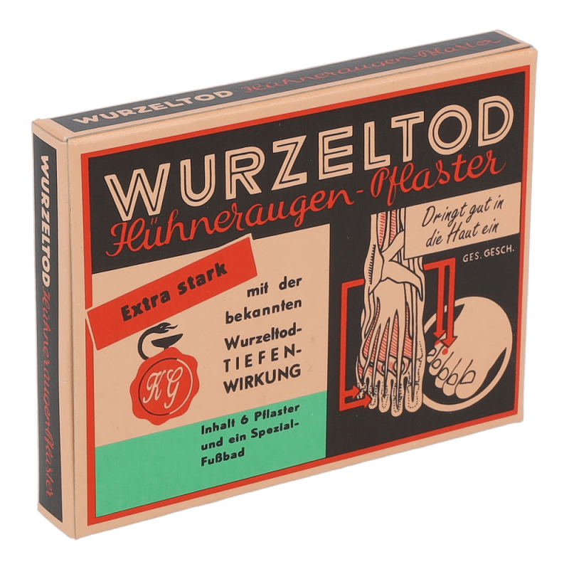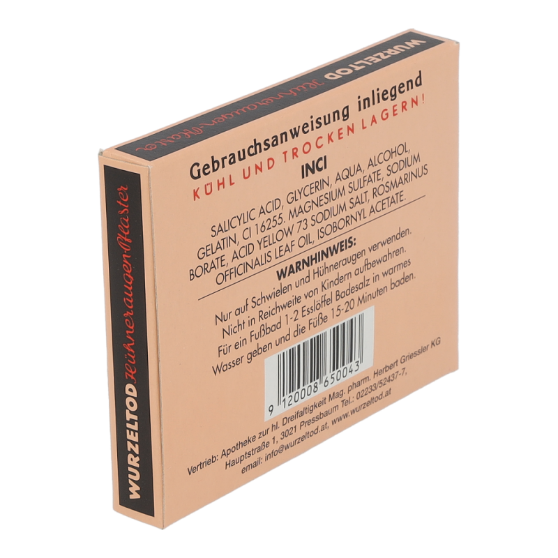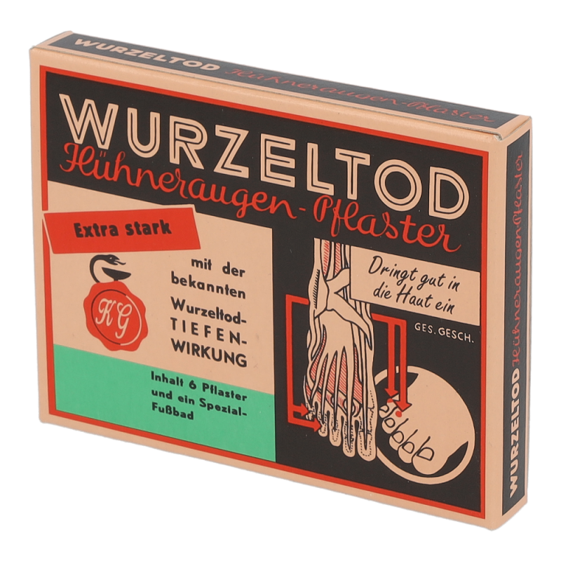 Wurzeltod Kurpackung 6 Pflaster + Bad vereint zwei Klassiker für eine rasche Entfernung des schmerzenden Hühnerauges. In der Wurzeltod Kurpackung befinden sich sechs Hühneraugenpflaster und ein Säckchen Badesalz. So können Sie vor dem Pflasterwechsel den Fuß mit einem Bad verwöhnen und das Ablösen der verhornten Haut fällt noch leichter.