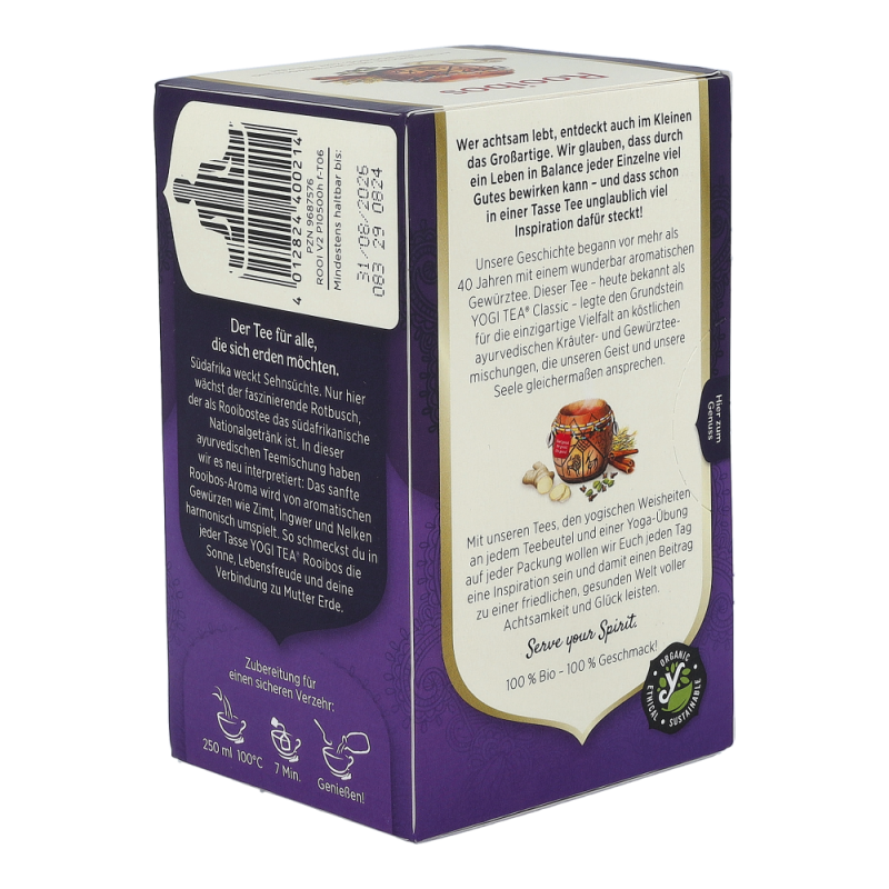 Yogi Tee Rooibos ist voll afrikanischer Folklore. Die leckere Gewürzbeigabe von Zimt, Ingwer, Kardamom und ein wenig schwarzer Pfeffer bringt sein mildes, erdiges Aroma zum Tanzen. Karob und Vanille runden den Geschmack ab.
