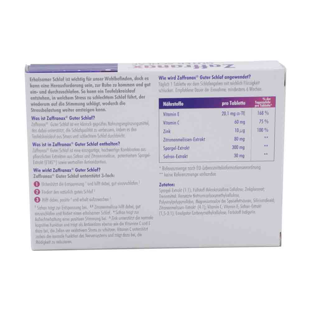 Bei Zaffranax Guter Schlaf Tabletten handelt es sich um ein Nahrungsergänzungsmittel mit Extrakten aus Safran, Spargel und Zitronenmelisse sowie Vitamin C, E und Zink. Das Präparat fördert daher die Entspannung und unterstützt einen erholsamen Schlaf. Stress kann häufig Schwierigkeiten beim Ein- sowie Durchschlafen bereiten und dadurch das allgemeine Wohlbefinden beeinträchtigen. Die Zaffranax Guter Schlaf Tabletten versorgen den Organismus mit einer speziellen Kombination aus wertvollen pflanzlichen Extrakten sowie Antioxidantien, welche die Entspannung sowie einen erholsamen Schlaf unterstützen. Safran fördert eine positive Stimmung und trägt zur Entspannung bei. Zitronenmelisse unterstützt das Einschlafen und sorgt für einen erholsamen Schlaf. Vitamin C, E sowie Zink bewahren die Zellen vor oxidativem Stress und Zink fördert zusätzlich eine normale kognitive Funktion. Vitamin C trägt zudem zu einer normalen Funktion des Nervensystems sowie zu der Reduktion von Müdigkeit bei. Somit bietet das Präparat die idealen Voraussetzungen, einen entspannten sowie erholsamen Schlaf zu unterstützen.