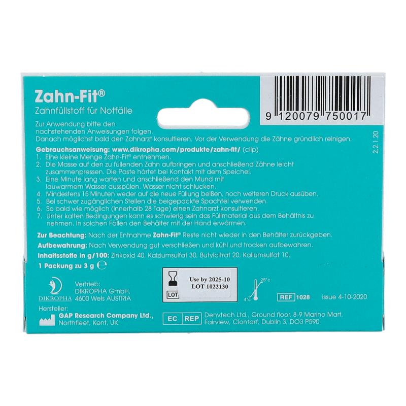 Zahn-Fit Zahnfüllstoff 3 g ist Ihre Selbst- und Soforthilfe! Sie haben eine Zahnplombe verloren? Mit Zahn-Fit können Sie diese sofort und vorübergehend ersetzen. Das Produkt ist direkt anwendbar und muss nicht erst angerührt werden – jetzt in Ihrer Österreichischen Versandapotheke bestellen!